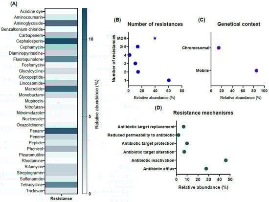 Antimicrobial resistance genes (ARGs) detected in hospital wastewater by metagenomic screening. (A) Distribution of ARGs across 31 antimicrobial families, with cephalosporins, penams, macrolides, aminoglycosides, tetracyclines, and fluoroquinolones being the most abundant. (B) Multidrug resistance profile showing that ~40% of ARGs confer resistance to multiple drug classes, with 14% linked to five or more. (C) Genetic context of ARGs indicating their predominant association with mobile genetic elements such as plasmids and integrons, in addition to chromosomal DNA. (D) Functional mechanisms of resistance highlighting antibiotic inactivation enzymes, efflux pumps, and less frequent determinants of target modification, replacement, and protection. The dots indicate the relative abundance for each of the categories shown in the graphs, while the asterisk in (B) indicates the relative abundance that refers to the sum of genes that confer resistance to two or more antimicrobial classes (MDR).