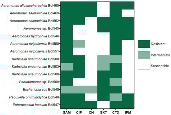 In addition, bacterial cultures were established to evaluate antimicrobial resistance in hospital wastewater (Figure 2). The 14 bacterial isolates described above were tested in an antimicrobial susceptibility test using six antibiotics (Supplementary Table S1). Antibacterial drugs used were Ampicillin/Sulbactam, Ciprofloxacin, Gentamicin, Trimethoprim/Sulfamethoxazole, Cefotaxime, and Imipenem (namely as SAM, CIP, CN, SXT, CTX, and IPM, respectively). Among the susceptibility tests, Aeromonas spp. species were the strains that exhibited the lowest susceptibility to different drugs. Specifically, the isolates identified as Aeromonas salmonicida and Aeromonas allosaccharophilla, respectively, displayed strong resistance to almost all the tested antibiotics but one. Other Aeromonas isolates were also identified as A. salmonicida and Aeromonas spp. showed resistance mainly to Ampicillin/Sulbactam and Cefotaxime. Conversely, isolates Enterococcus faecium and Raoultella ornithinolytica were resistant to all antibiotics except Trimethoprim/Sulfamethoxazole and Gentamicin, respectively. The Klebsiella spp. and Escherichia coli isolates exhibited a loss of susceptibility to Trimethoprim/Sulfamethoxazole and Cefotaxime. The E. coli strain only exhibited high susceptibility to Imipenem. Overall, ampicillin/sulbactam and cefotaxime resistance were present in all the isolates, showing reduced effectiveness. Next, ciprofloxacin (CIP) and trimethoprim-sulfamethoxazole (SXT) resistances were presented in Klebsiella, Escherichia, and Enterococcus isolates, while Aeromonas isolates were susceptible. Finally, gentamicin (CN) and imipenem (IPM) exhibited higher efficacy, with fewer resistant isolates to these drugs, although Enterococcus spp. isolate was resistant to both antimicrobials (Figure 2). In summary, antimicrobial susceptibility testing revealed a high prevalence of resistance among the bacterial isolates recovered from hospital wastewater.
