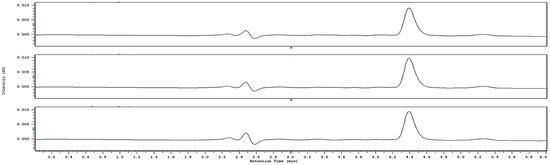 Chromatographic detection of paracetamol in hospital wastewater using HPLC-DAD. The chromatogram, shown in triplicate, reveals a well-defined peak at a retention time of approximately 4.4 min, corresponding to paracetamol. The compound was quantified at an average concentration of 277.4 ± 10.7 µg/L, with a maximum of 288.1 µg/L. In contrast, ampicillin was analyzed under the same methodology but was not detected, likely due to its rapid degradation in aqueous matrices, as also reported in previous analytical studies of wastewater effluents.