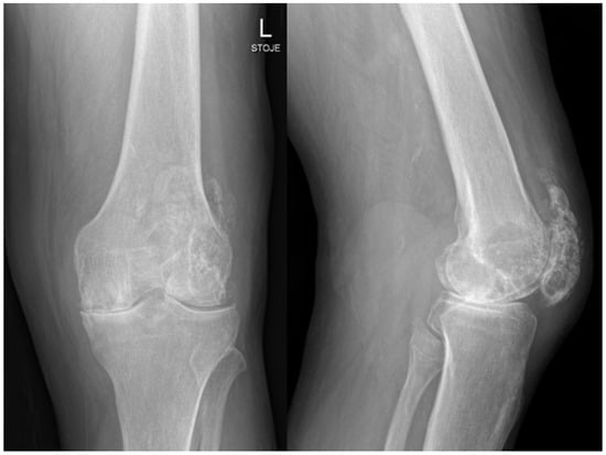 Radiology of left knee—anteroposterior and lateral views of the knee before implantation of total knee endoprosthesis, showing severe knee osteoarthrosis with heterotopic ossifications after quadriceps rupture and surgical treatment years ago.