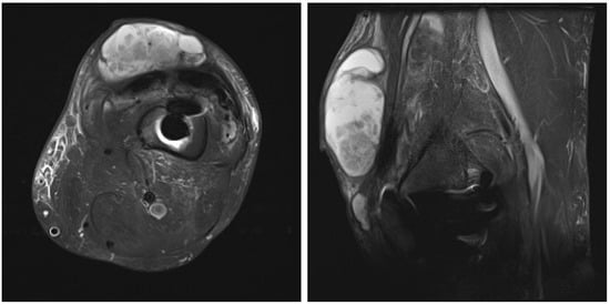 Contrast-enhanced magnetic resonance image of left knee: axial and lateral view of the left knee showing pronounced synovitis intra-articular with a small effusion, extending through the defect of the quadriceps tendon just above the patella into the subcutaneous tissue suprapatellar, forming a large septate collection, small osteolysis around the femoral part of knee endoprosthesis.