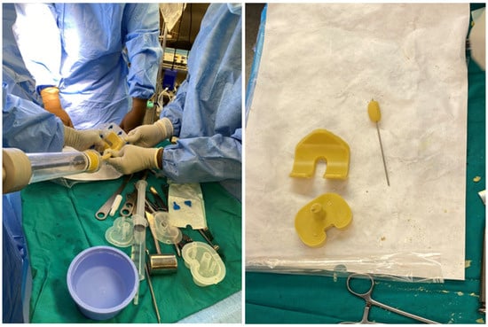 Candida parapsilosis grew in both synovial fluid samples from separate aspirations and was identified by standard microbiology methods at the microbiology laboratory at the National laboratory of health, environment and food, Maribor. Unfortunately, a mycogram was not obtained, as it is not performed in all samples routinely at the laboratory. According to the retrospective analysis of bloodstream fungal infection from central Slovenia, the Candida parapsilosis resistance rate to fluconazole was very low, and we decided to start the treatment preoperatively with oral fluconazole 400 mg/day []. A decision to perform a two-stage revision surgery with a 4-week interval was taken. The first stage was performed in October 2024, involving the complete removal of the implant, debridement, and insertion of an antibiotic- and antifungal-impregnated cemented spacer. For the spacer, we used Palacos R+G® cement (Heraeus Medical GmbH, Wehrheim, Germany), with each package containing 40.8 g of cement powder, 20 mL of monomer liquid, and 0.5 g of industrially premixed gentamicin. Additionally, we supplemented it with 0.25 g of non-liposomal amphotericin B deoxycholate powder (Fungizone®, Delpharm, Boulogne-Billancourt, France) per package. A total of three packages were used, resulting in a cumulative amphotericin B dose of 0.75 g. The cement powder, antifungal powder, and monomer liquid were thoroughly blended by hand, resulting in a yellowish-colored bone cement of proper hardness. In Figure 3, the preparation of an antifungal-impregnated cemented spacer is shown. During the operation procedure, 5 intraoperative tissue samples, synovial tissue samples, 2 bone tissue samples with residual non-resorbable suture material, and the explanted prosthesis were collected for further microbiological analysis; sonication of the explanted material was performed and sonication fluid cultured according to a standardized protocol. Candida parapsilosis grew from all tissue samples, bone samples, and from the sonication fluid of the removed implant in low concentration, 3 CFU/mL. Tissue samples were also sent for histopathology exam, and acute inflammation was confirmed. Antifungal therapy with intravenous caspofungin (70 mg) was started preoperatively, then 50 mg/day for two weeks, followed by an oral switch to fluconazole at 400 mg/day. The patient continued fluconazole therapy until the second stage of surgery, with no drug holiday before reimplantation was planned. In Figure 4, the left knee is presented in radiography after the first-stage surgery with insertion of an antibiotic- and antifungal-impregnated cemented spacer.