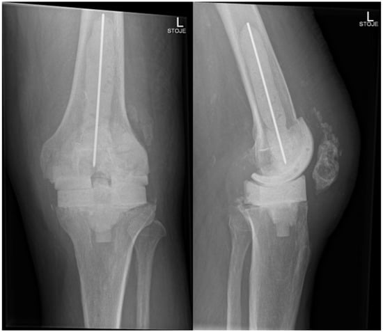 In November 2024, four and a half weeks later, the second stage was performed, involving the removal of the spacer and reimplantation of the revision prosthesis. The reimplantation procedure was a complex and surgically demanding procedure. A significant bone defect, in combination with a degenerative cyst in the lateral femoral condyle, required careful management during the reimplantation procedure. The cyst added complexity to the structural integrity of the femoral condyle, demanding attention to ensure proper fixation of the new prosthesis. Additionally, wound closure proved difficult, since it was impacted by scar tissue resulting from the previous two surgeries. Moreover, the patient had an attenuated quadriceps tendon, which added to the challenges of achieving stable joint function post-revision. The weakened tendon posed a risk for compromised rehabilitation and further functional limitations. Tissue samples, including synovial tissue and a portion of patellar bone with residual non-resorbable suture material and spacer, were once again obtained for microbiological analysis. The spacer was sonicated, and the sonication fluid was cultured. Preoperatively, the patient received 70 mg intravenous caspofungin, piperacillin/tazobactam at 4.5 g every 8 h, and 1–1.5 g of vancomycin every 12 h (depending on serum levels) until the microbiological results of the intraoperative samples were available. Tissue samples remained sterile, and after two weeks, the patient was discharged home on oral fluconazole therapy (400 mg/day) for the next 6 months. A prolonged suppressive antifungal therapy is planned thereafter (200 mg daily for the next 6–12 months). Upon discharge, inflammatory parameters were in decline (CRP 13 mg/dL), and the surgical wound was adequately healed. At the last follow-up check-up 11 months after the surgery in October 2025, the patient’s knee was painless, without effusion, and the surgical wound healed. The knee mobility was from 0 to 100 degrees, and greater flexion is not expected due to the quadriceps scar. The patient is pain-free and can handle all daily loads. The Knee injury and Osteoarthritis Outcome Score (KOOS) is 84. Inflammatory markers remained negative, indicating no signs of infection or ongoing inflammation. The patient experienced no side effects from antifungal therapy. He is still on fluconazole 200 mg orally, but the suppressive therapy will be stopped in 1 month (12 months after surgery). Further careful clinical monitoring is planned. This clinical progression suggests a favorable post-revision outcome, with the patient tolerating the suppressive antifungal treatment well. The patient is satisfied with the treatment result. In Figure 5, radiography after the reimplantation of the revision endoprosthesis is presented.