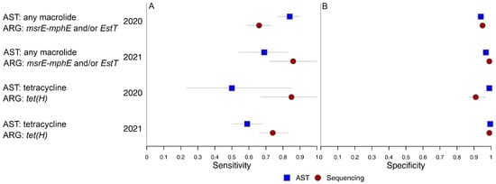 Further complicating the comparison of genotype and phenotype, resistance often results from interactions among multiple genes and regulatory elements []. The detection of an ARG does not guarantee its expression. Regulatory mechanisms, environmental factors, or laboratory conditions could suppress gene expression and lead to phenotypic susceptibility despite the presence of an ARG. However, in our study, diagnostic Sp for both AST and metagenomic sequencing were high for macrolides but slightly lower for tetracyclines in one of the two data sets, suggesting most of the detected target genes were expressed. However, diagnostic Se for metagenomics was more variable depending on the resistance pattern and population, suggesting undetected or unknown resistance mechanisms.