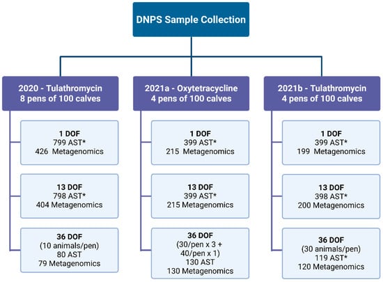 The DNPS collected and utilized in this study resulted from planned samples from calves not showing signs of clinical BRD. The metagenomic sequencing performance could be different in animals with clinical BRD that could be shedding a greater pathogen load [,]. Phenotypic AMR and ARGs would be expected to vary across animals that had received different antimicrobials for metaphylaxis or multiple antimicrobial treatments [,,,,,,]. Therefore, further investigations into the utility of metagenomic sequencing as a laboratory tool for BRD and AMR in cattle with clinical disease are warranted.