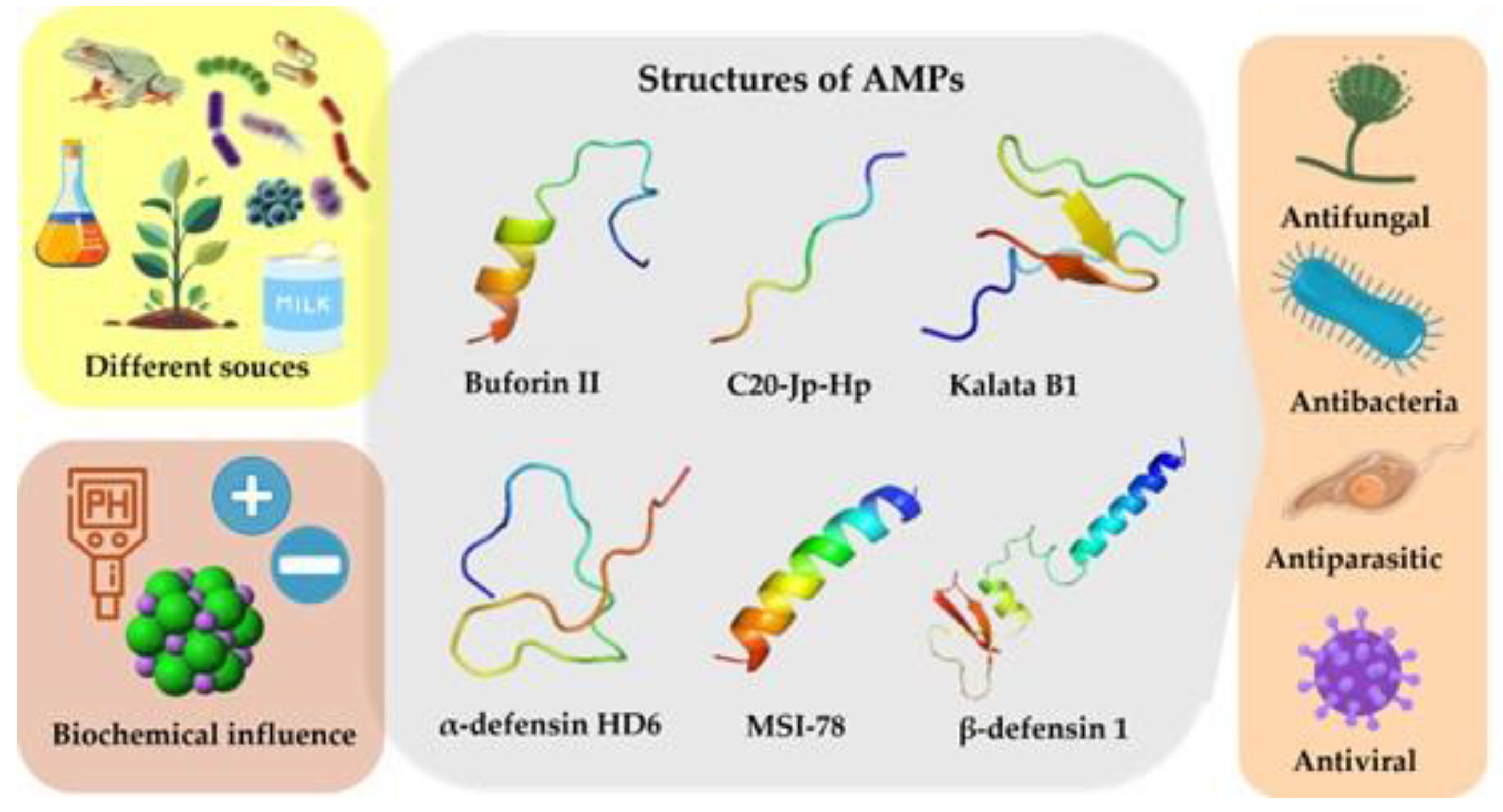 Antimicrobial peptides come from various sources, and their structural and biochemical characteristics, such as amino acid composition and three-dimensional structure, affect both their biological activity and mechanism of action (Figure 2). Despite their diversity, many AMPs share common features, including low molecular weight, positive charge, and hydrophobic residues [5].