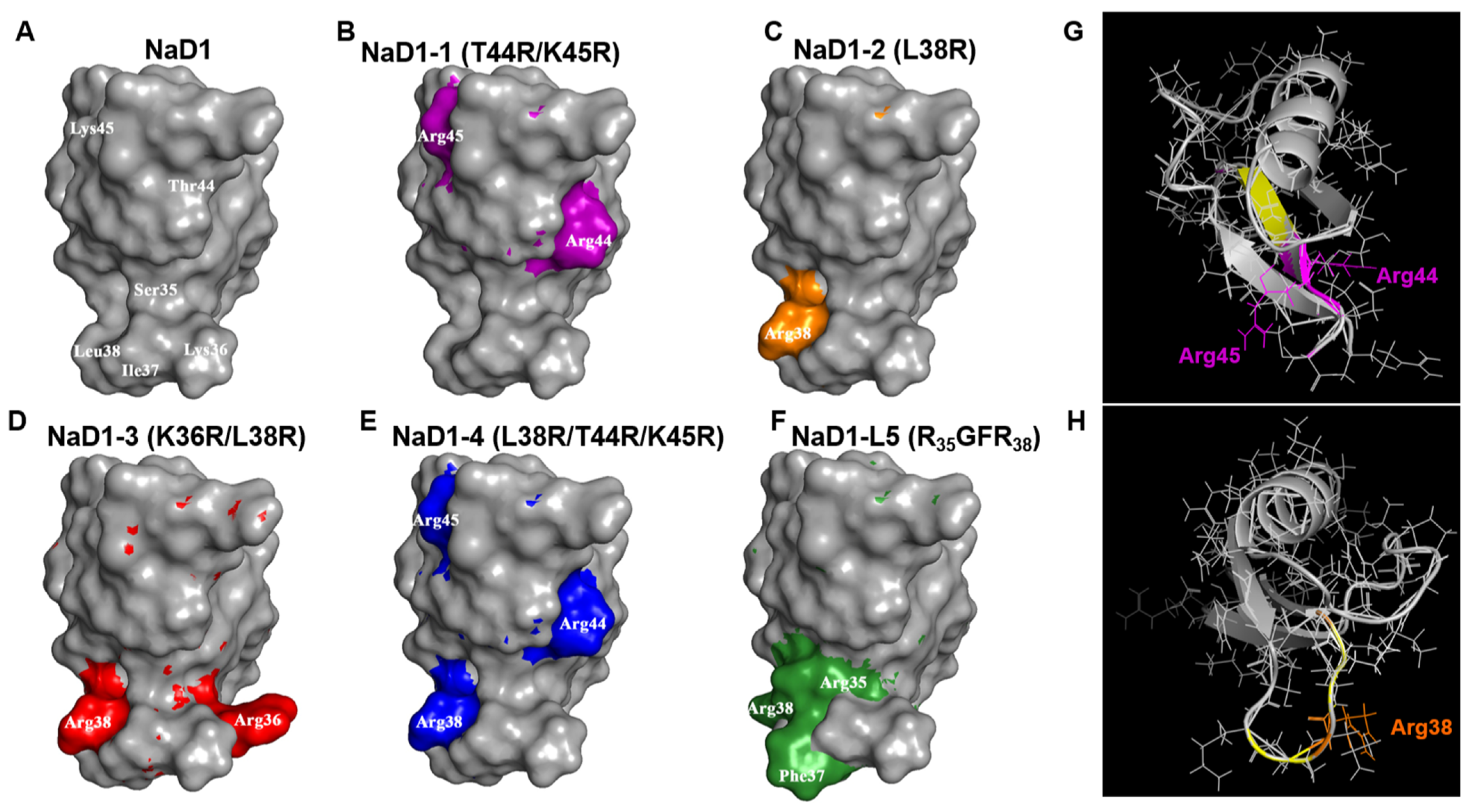 Figure 2B–F). Arg44 and Arg45 in the C-terminal regions of NaD1-1 and NaD1-4 were oriented in different directions on the surface of the modified analogues; a similar phenomenon was observed for Arg36 and Arg38 in NaD1-3, which were introduced into the L5 loop (
