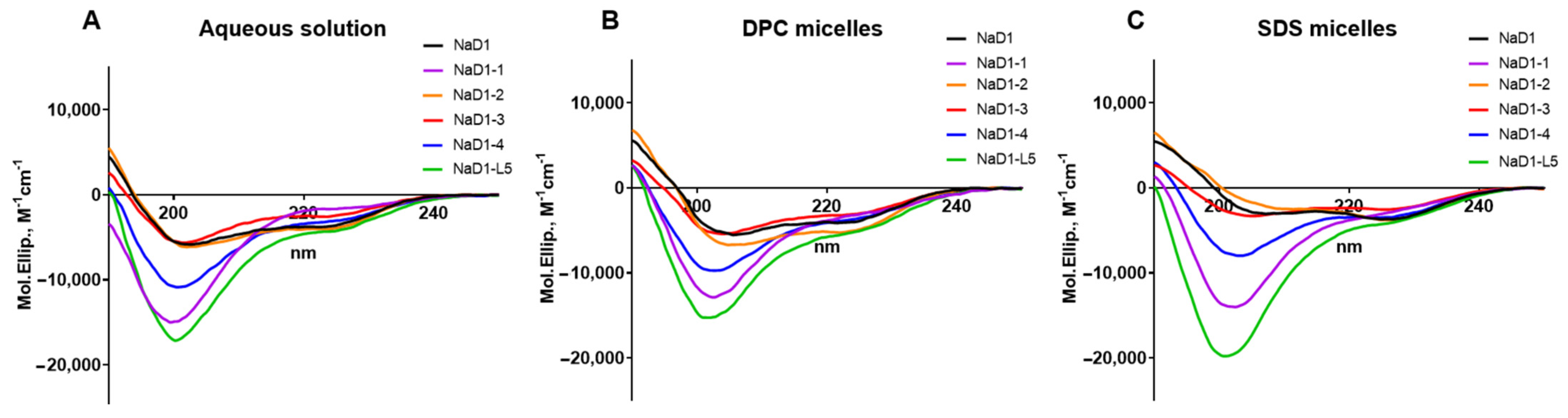 Supplementary Materials, Figure S1–S4, Table S1). The secondary structure of NaD1 and its analogues in an aqueous solution and in the presence of DPC or SDS micelles was examined by circular dichroism (CD) spectroscopy (