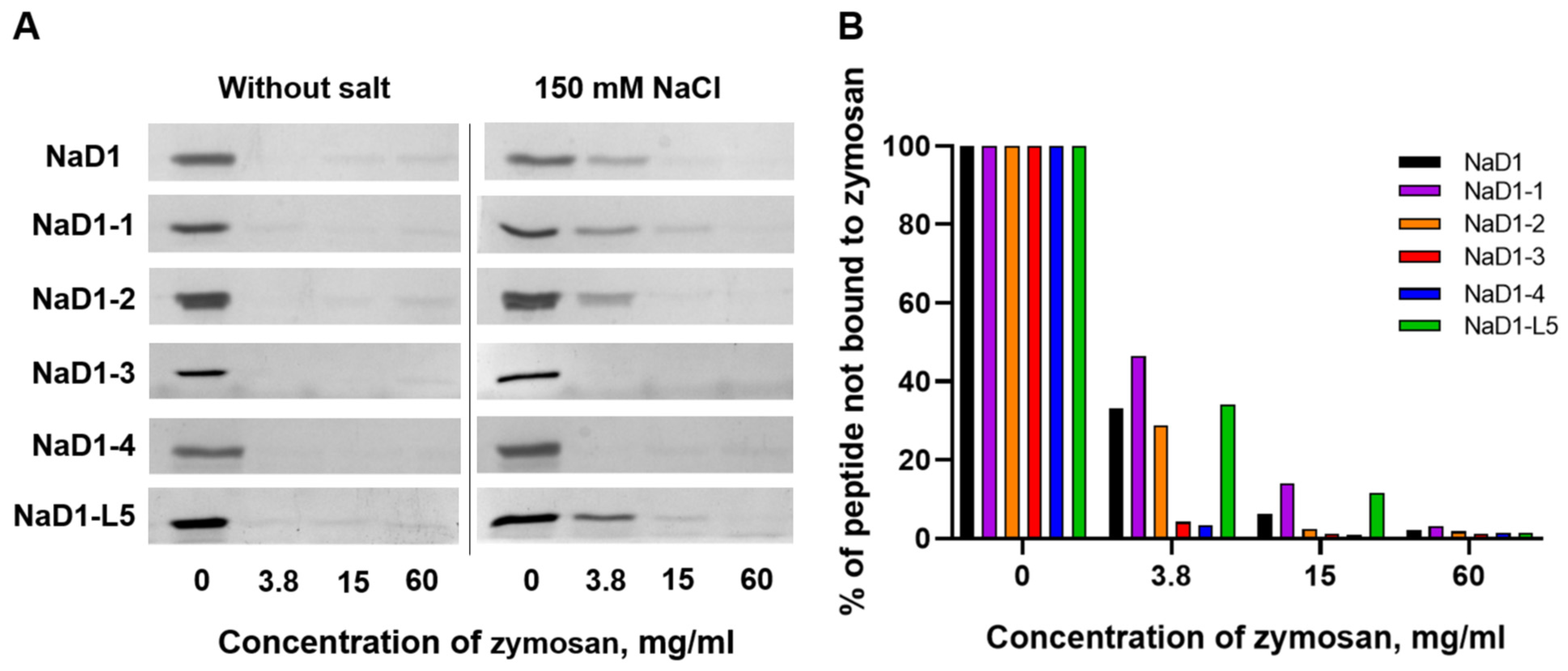 Figure 7A). In the presence of 150 mM NaCl, the binding efficiency of NaD1, NaD1-1, and NaD1-2, as well as NaD1-L5, was reduced, as indicated by the stronger residual peptide bands at low zymosan concentrations compared to the salt-free condition (