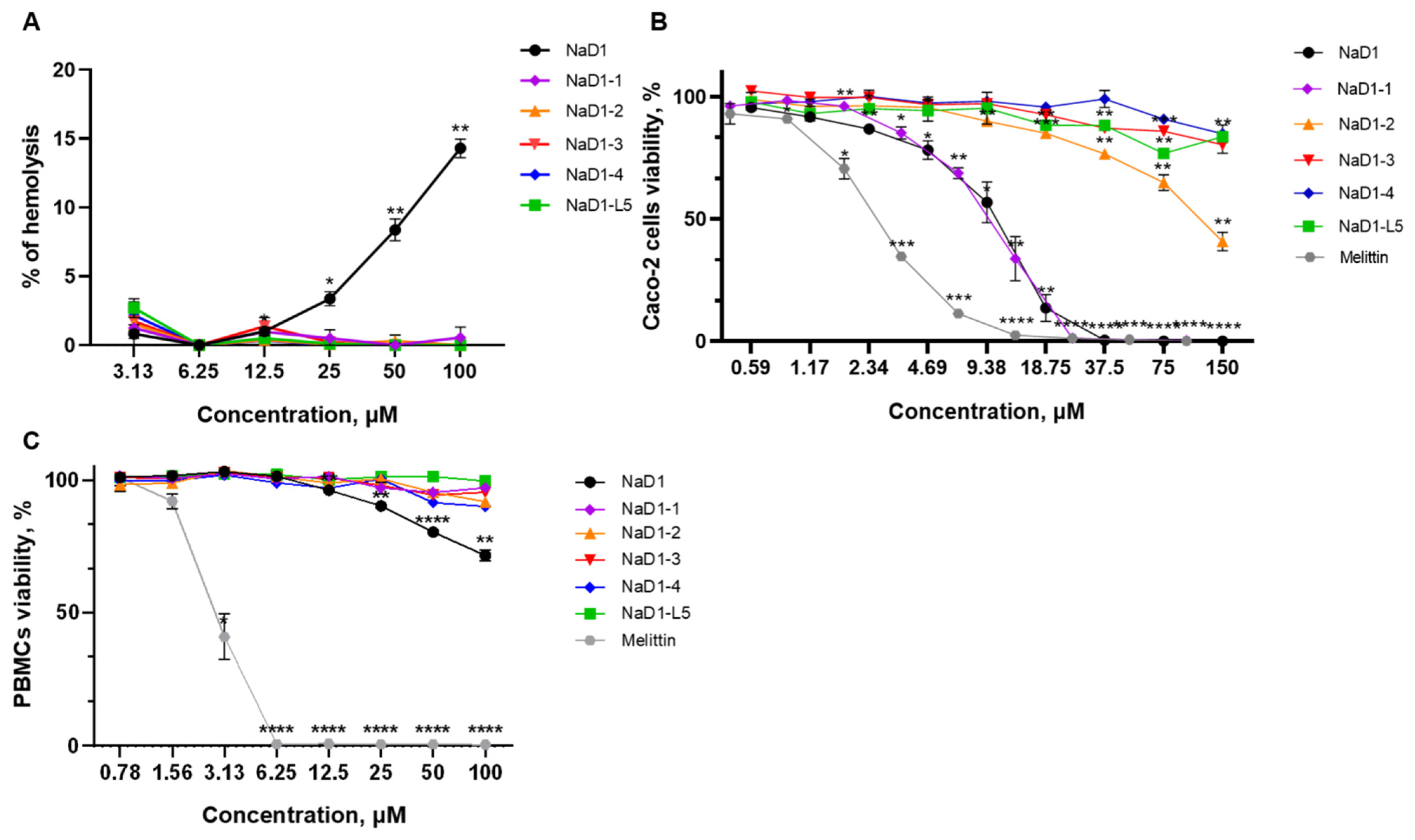 Cytotoxic activity of the peptides was investigated against human peripheral blood mononuclear cells (PBMCs) and the Caco-2 epithelial monolayer as an in vitro model of the intestinal barrier using a RPMI-1640 medium and resazurin-test. NaD1 demonstrated high toxicity against the Caco-2 monolayer and cell viability was 50 and 0% at its concentrations of 10.5 and 37.5 µM, respectively (