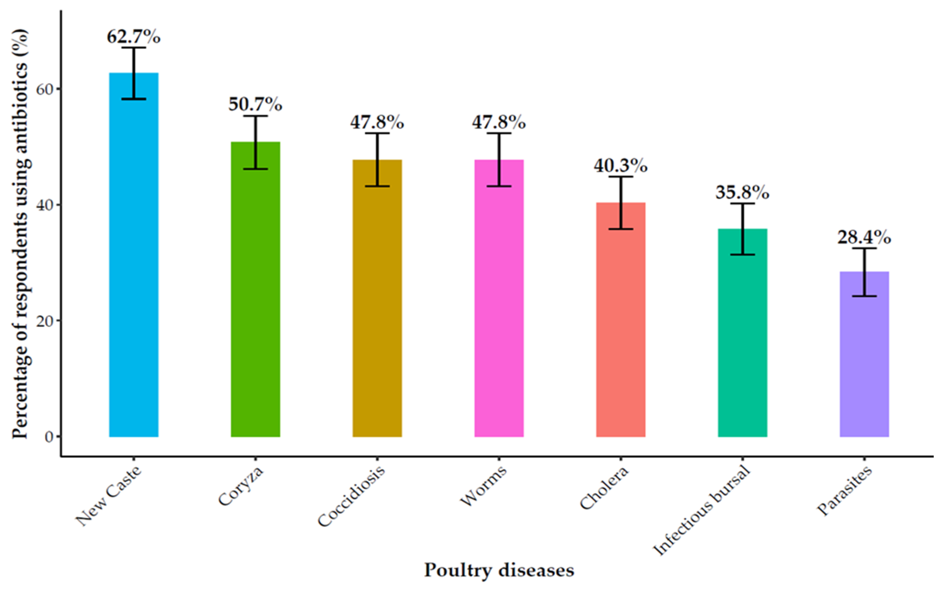 - Hassan, M.M.; Kalam, M.A.; Alim, M.A.; Shano, S.; Nayem, M.R.K.; Badsha, M.R.; Al Mamun, M.A.; Hoque, A.; Tanzin, A.Z.; Nath, C.; et al. Knowledge, Attitude, and Practices on Antimicrobial Use and Antimicrobial Resistance among Commercial Poultry Farmers in Bangladesh. Antibiotics 2021, 10, 784. [Google Scholar] [CrossRef]