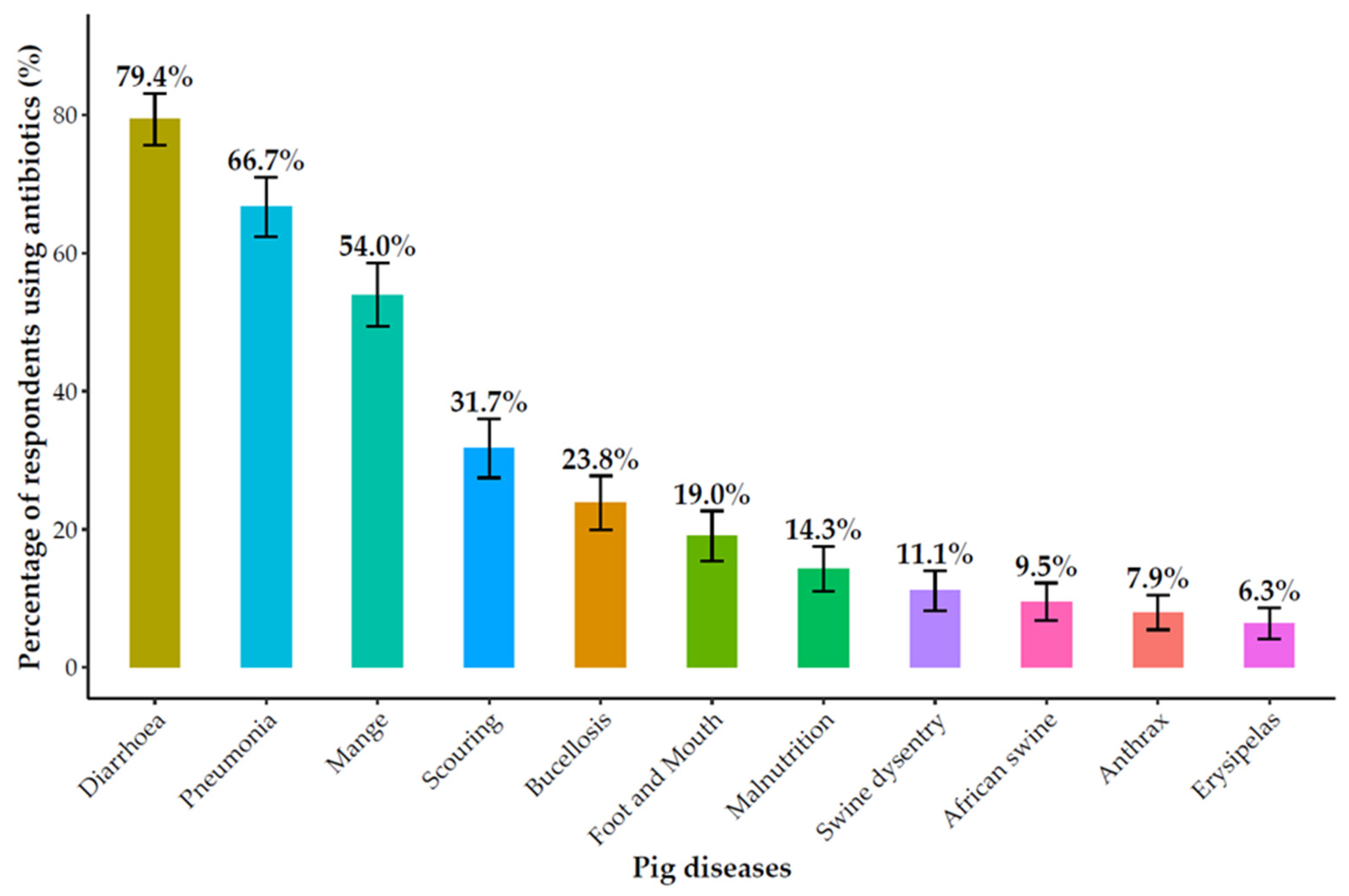 - Adebowale, O.O.; Adeyemo, F.A.; Bankole, N.; Olasoju, M.; Adesokan, H.K.; Fasanmi, O.; Adeyemo, O.; Awoyomi, O.; Kehinde, O.; Fasina, F.O. Farmers’ Perceptions and Drivers of Antimicrobial Use and Abuse in Commercial Pig Production, Ogun State, Nigeria. Int. J. Environ. Res. Public Health 2020, 17, 3579. [Google Scholar] [CrossRef] [PubMed]
