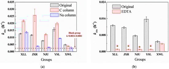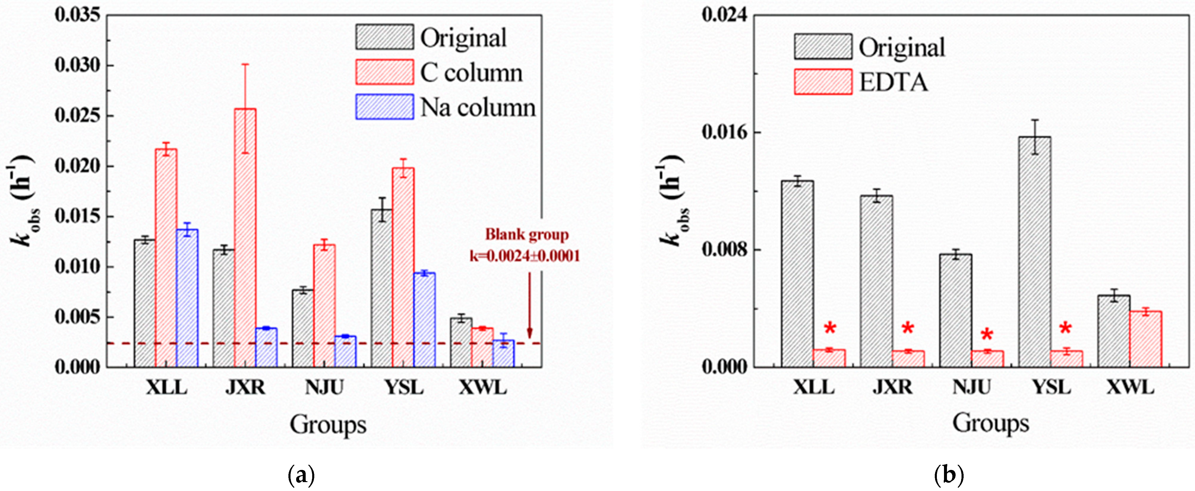 Five sampled waters were filtered through the C column and Na column to eliminate the components of organic matter and cation ions (except for Na), respectively. After Na column treatment, most cation ions in the five waters were replaced by Na ions, and the concentrations of most heavy metals (Al, Fe, Mn, etc.) were undetectable (Table S2). On the contrary, the concentrations of Ca2+, Mg2+, and K+ in the C column treatment were nearly unchanged compared to the original waters, and the TOC concentration of these samples was all below 1 mg L−1. According to Figure 1a, lack of cation ions in the Na column treatment inhibited the PG hydrolysis, while the organic matter removal in the C column treatment facilitated PG hydrolysis. Thus, cation ions (Ca, Mg, and heavy metals) were deemed to be a significant factor in the hydrolysis of PG. Additional EDTA (1 mM) was added to further confirm the effects of cations on hydrolysis. The dominant inhibition was observed in four waters (XLL, JXR, NJU, and YSL, Figure 1b), suggesting the important role of natural cations. Among them, there was no significant difference in the original, C column, and Na column XWL (Figure 1a), probably due to the relatively low salinity in XWL. The hydrolysis rate of PG in XWL was also the lowest, indicating that cation-catalyzed hydrolysis might not be the main pathway of PG hydrolysis in XWL water.