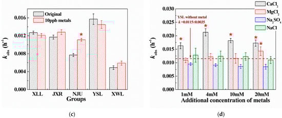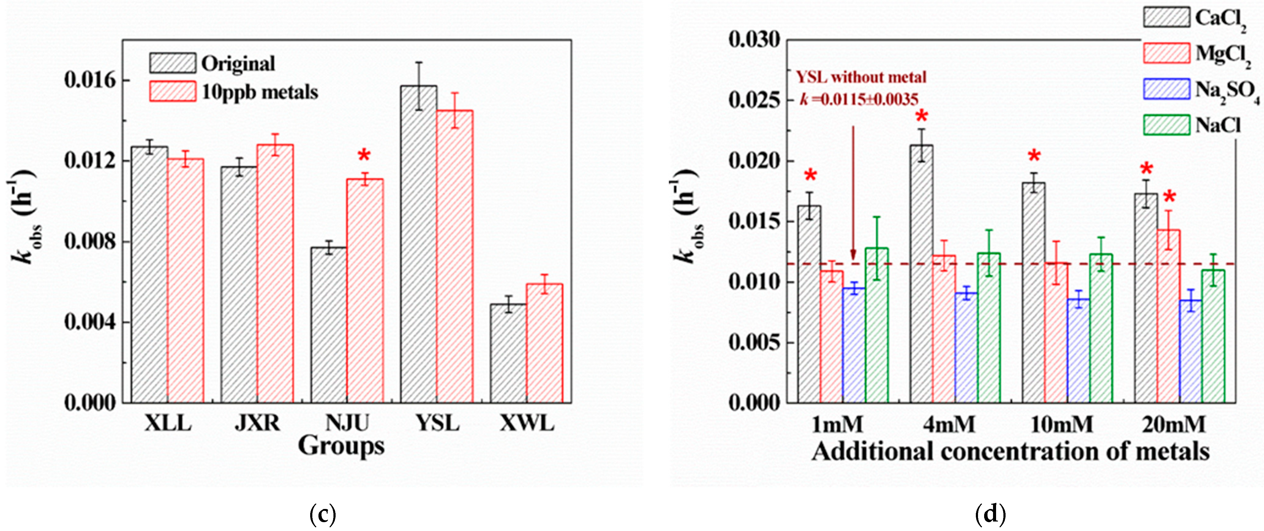 Degradation kinetics constants (kobs, h−1) of PG hydrolysis in the five surface waters with different treatments. (a) PG hydrolysis in the original, C column-, and Na column-treated samples. (b) PG hydrolysis in the original and EDTA-treated (1 mM) samples. (c) PG hydrolysis in five surface waters with additional heavy metals, including Fe, Zn, Cu, Mn, Co, Ni, and Pb (10 μg L−1). (d) PG hydrolysis in YSL water with the additional CaCl2, MgCl2, Na2SO4, and NaCl (1, 4, 10, and 20 mM). The initial concentration of PG was 20 μM, and the temperature of the reaction was 30 °C. * means a significant correlation (p < 0.05) against other groups.