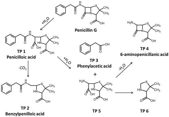 In brief, the reaction pathways for PG hydrolysis were initiated by the cleavage of the ester bond in the β-lactam ring, and then decarboxylated to form benzylpenilloic acid (Figure 3). The active sites of PG hydrolysis could also occur in the branched amide bond to form TP 4 and TP 5. Furthermore, the branched chain in TP 5 could continue to hydrolyze to form TP 6. Penicilloic acid and benzylpenilloic acid were detected as mainly hydrolysis products in our experiments, which were found to be relatively environmentally persistent in natural water []. These degradation product residues in the environment might reveal the potential environmental risks, which should be evaluated in the future.