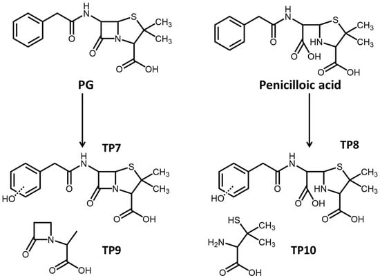 Photolytic products of PG were also measured, and hydrolysis products like penicilloic acid could also be found in the photolysis process. The primary photolytic products involved the hydroxylation of PG and penicilloic acid, which dominantly occurred in the benzene ring to form the intermediate products (TP 7 and TP 8, Figure 4). In the direct photolysis process, the thiazole ring in the PG molecule would be destroyed to form low-molecular-weight carboxylic acids as TP 9 and TP 10 (Figure 4). Furthermore, volatile products, including benzene and toluene, were also found during the PG photolysis. The low-molecular-weight products were mostly volatile substances and not stable in the environment, with ecological risk being relatively low.