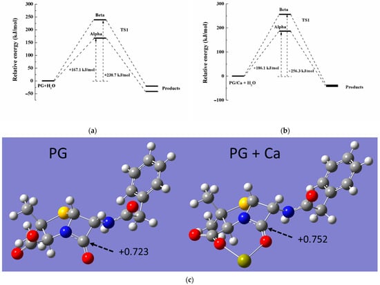 To further confirm the hydrolysis process in the Ca-PG complex, theoretical computation was used to identify the reaction pathway and the associated energy of the transition state (TS). Since the carboxyl group of the PG molecule would be completely deprotonated in neutral solution, the PG species was selected as a target model in the calculation. Previous research demonstrated that the Ca2+ ion could be coordinated either via the O atom in carboxyl and the O atom in carbonyl in beta-lactam of the PG molecule []. Therefore, the structure of the Ca-PG complex has been optimized by using the basis set of 6-311G(d,p), and the optimized PG molecule was also obtained in Figure 5c. After the Ca2+ ion coordination, the positive charge of carbocation in the β-lactam ring increased from +0.723 to +0.752 (NBO charge, Figure 5c), indicating that the Ca-PG complex was more likely to be attacked by nucleophilic reagents in hydrolysis. Due to the spatial structure of the PG molecule, PG hydrolysis could be attacked by H2O from different directions (alpha-side and beta-side, Figure S4). During the hydrolysis, H2O attacked the amido bond in the β-lactam ring to form the TS, which was structured with H2O and the amide group from both alpha and beta sides (Figure S5). Based on the different activation energies of PG or PG/Ca hydrolysis, the activation energies of both PG and PG/Ca hydrolysis from alpha-side attack were lower than those from beta-side attack, indicating that H2O preferred to attack the amido bond from alpha-side (Figure 5a,b). However, the activation energy of Ca-PG (186.1 kJ mol−1) was higher than that of PG (167.1 kJ mol−1) itself, which did not correspond with the degradation rates in PG and PG/Ca hydrolysis. We speculated that direct hydrolysis catalyzed by H2O might not be the dominant pathway of PG in the hydrolysis of the Ca-PG complex. The hydroxyls combined with the Ca2+ ion might act as a strong nucleophile to attack the carbocation in β-lactam, which contributed to the rapid hydrolysis in the Ca-PG complex. Huang et al. also found similar catalyzed mechanisms of penicillin and cephalosporin antibiotics by metal ions, including Cu, Fe, Zn, and Mn [,,,,,].