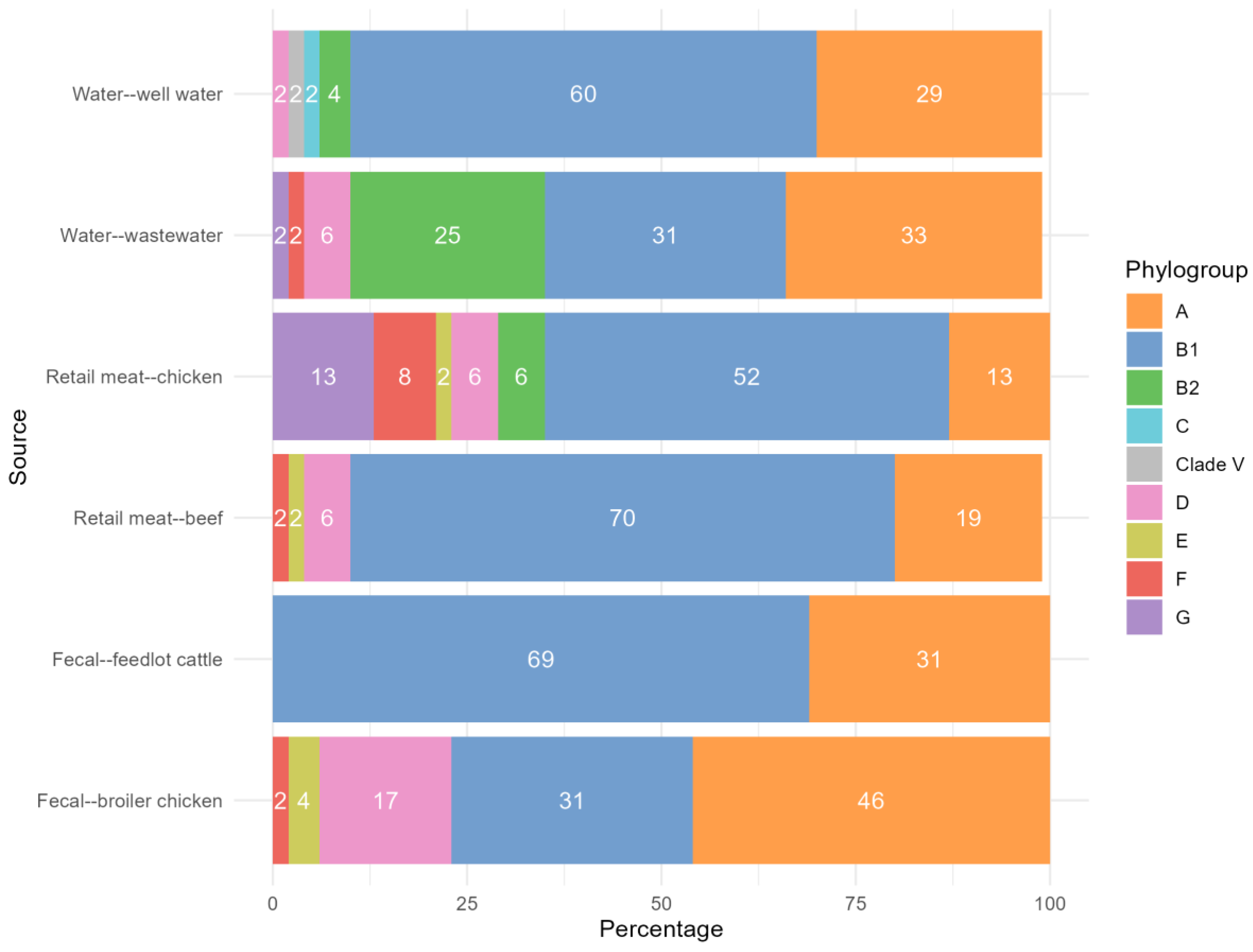 Whole-Genome Analysis of Escherichia coli from One Health Sources: Evaluating Genetic Relatedness and Antimicrobial Resistance Carriage