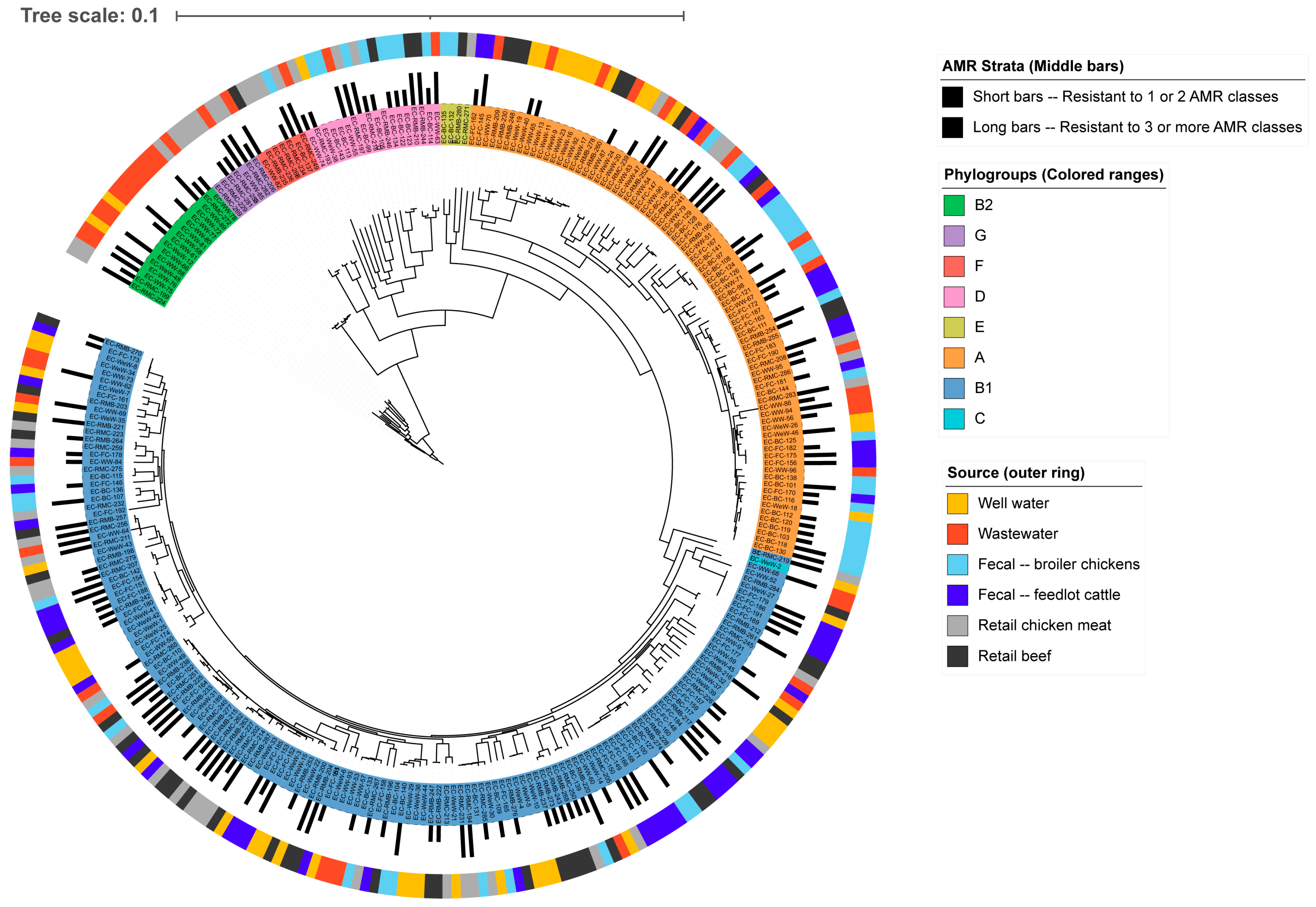 | Cluster | Number of Isolates | Sources (n) | Phylo-Group | Sequence Types (n) | AMR Strata (n) |
