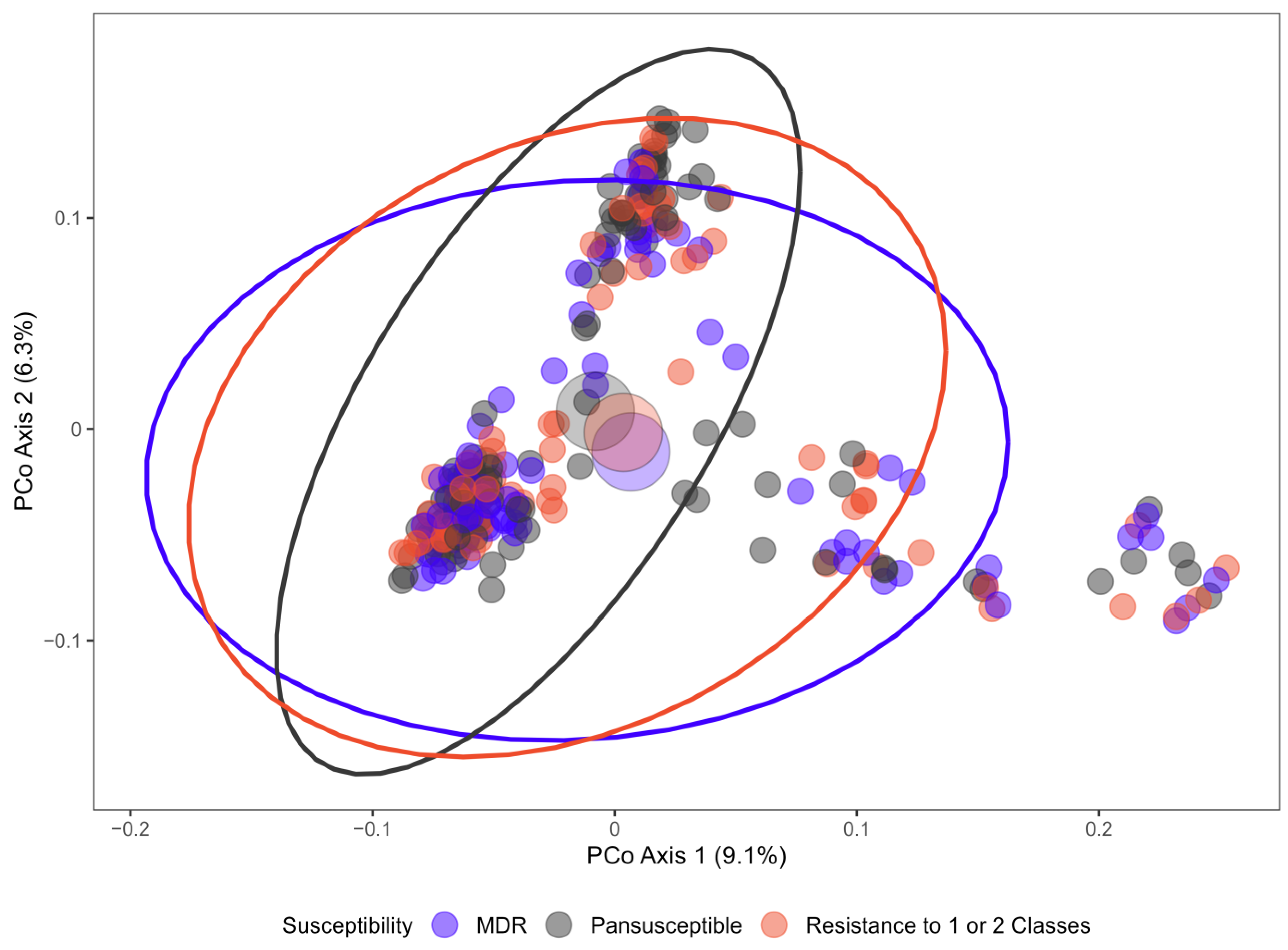 | Cluster 11 | 28 | Water—well water (5) | 58 (13) | Pan susceptible (8) | |