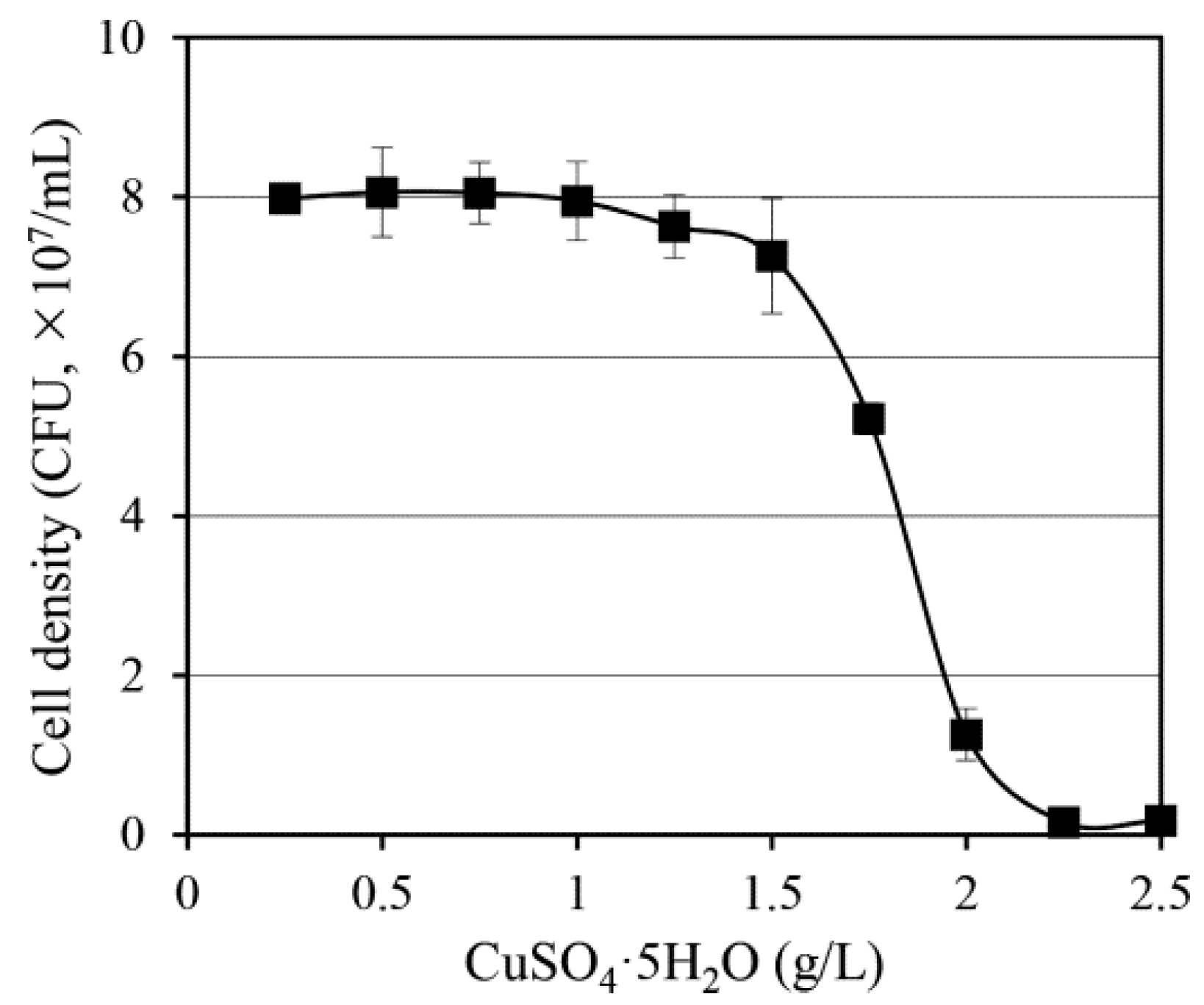 To determine the concentration at which copper inhibited yeast growth, S. cerevisiae W303 was inoculated into 20 mL of YPD medium containing varying concentrations of CuSO4·5H2O (0.25 to 2.5 g/L) in 250 mL Erlenmeyer baffled culture flasks. The cells were cultured at 30 °C and 250 rpm for 20 h. The cell density was measured in terms of CFUs. The culture was serially diluted, and 100 μL of each dilution was spread onto YPD agar plates (YPD medium with 1.5% agar). The plates were incubated at 30 °C, and the number of CFUs was counted.
