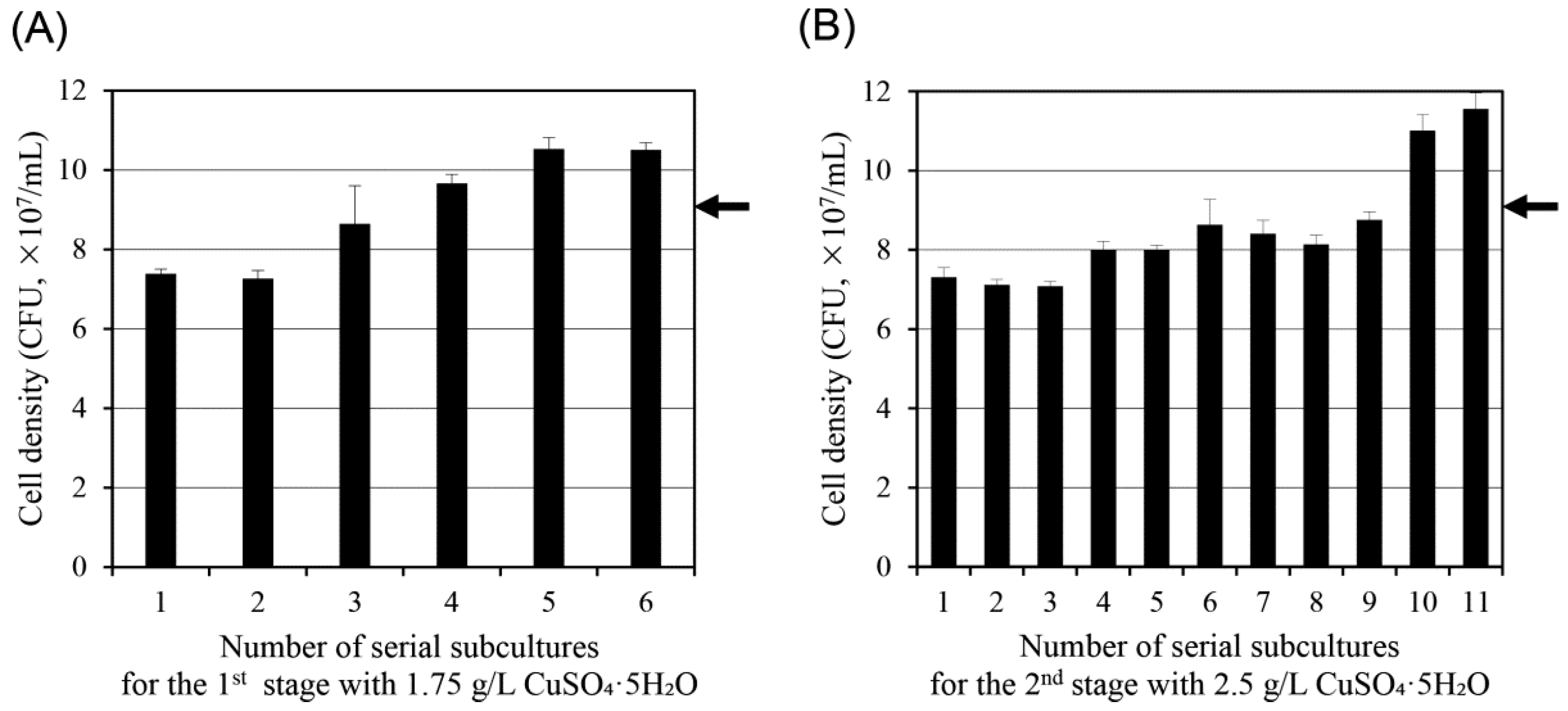 Figure 2A, the initial passages exhibited reduced growth relative to copper-free controls, but a gradual improvement in cell density was observed with each subsequent passage. By the sixth subculture, the adapted population displayed CFUs comparable to those observed at 1.5 g/L CuSO