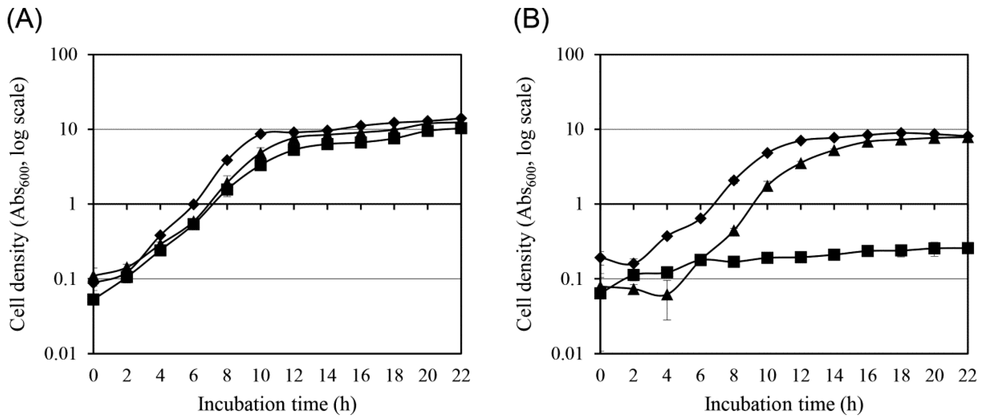 2O), the wild-type strain exhibited complete growth inhibition, with no increase in cell density throughout the incubation period (