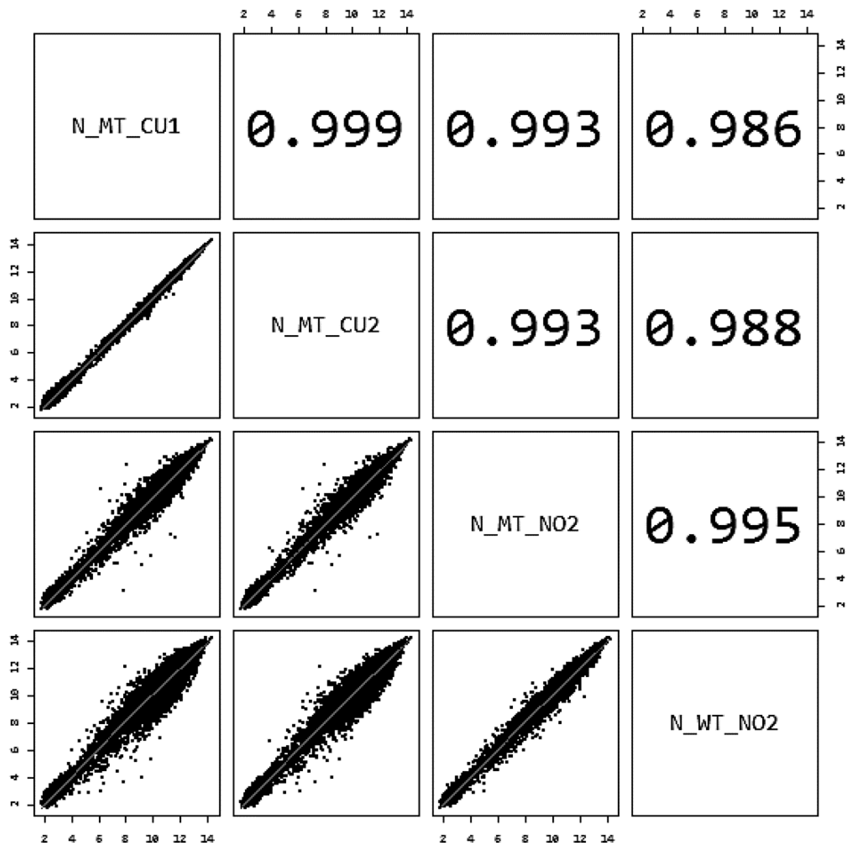 After hybridization, the arrays were washed and stained using the GeneChip Fluidics Station 450 (catalog number: 00-0079; Thermo Fisher Scientific Korea Ltd., Seoul, Republic of Korea) and scanned on a GeneChip System 3000 (catalog number: 00-0218; Thermo Fisher Scientific Korea Ltd., Seoul, Republic of Korea). Raw data were processed using Affymetrix GeneChip Command Console software ver. 3.1.4 (Thermo Fisher Scientific Korea Ltd., Seoul, Republic of Korea) and Affymetrix Expression Console software R 3.0.2 (Thermo Fisher Scientific Korea Ltd., Seoul, Republic of Korea), which included background correction, summarization, and quantile normalization using the robust multiarray average (RMA) method. Two biological replicates were initially prepared per condition. RNA integrity was evaluated, and the samples with the highest RIN values were selected (one WT_NO2, one MT_NO2, and two MT_CU replicates). Pearson correlation coefficients among samples exceeded 0.986 (