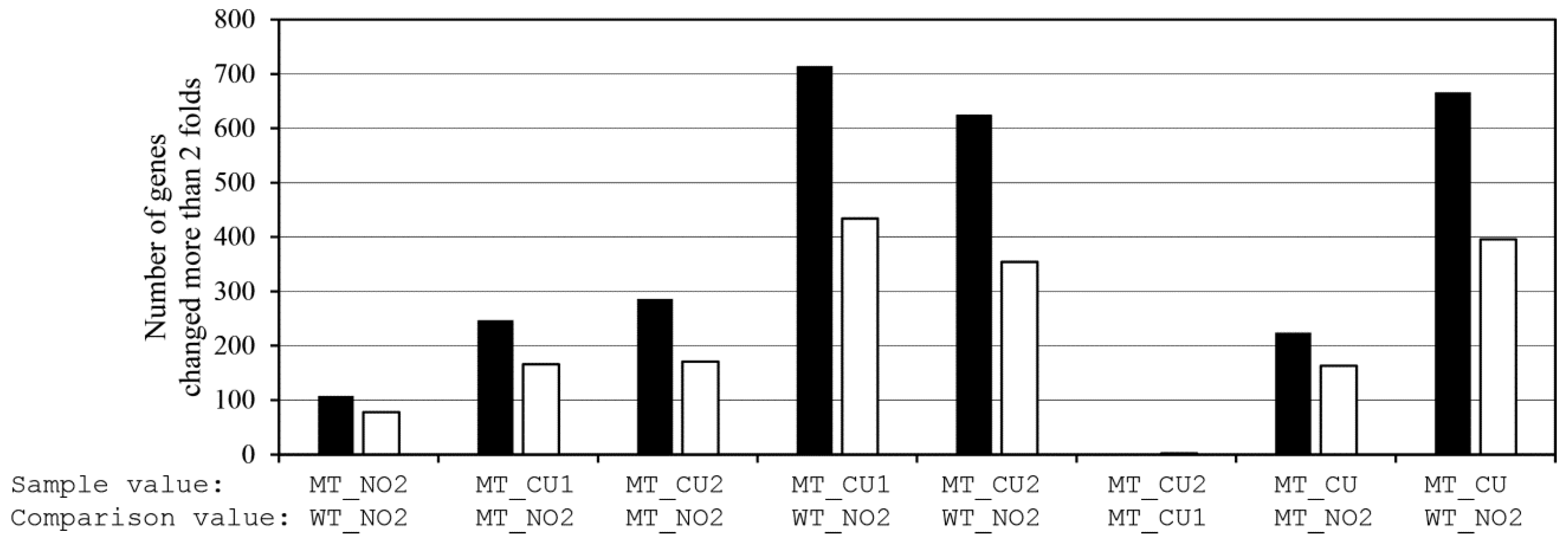 Figure 6). Of the eight combinations, the most substantial changes were observed in the comparisons involving the copper-treated mutant samples. Specifically, the MT_CU vs. WT_NO2 comparison yielded 1062 DEGs (666 upregulated and 396 downregulated). Similarly, MT_CU vs. MT_NO2 produced 387 DEGs, of which 224 were upregulated and 163 were downregulated, while MT_NO2 vs. WT_NO2 had 186 DEGs (108 upregulated and 78 downregulated). Other comparisons followed similar trends in accordance with the copper treatment and strain background.