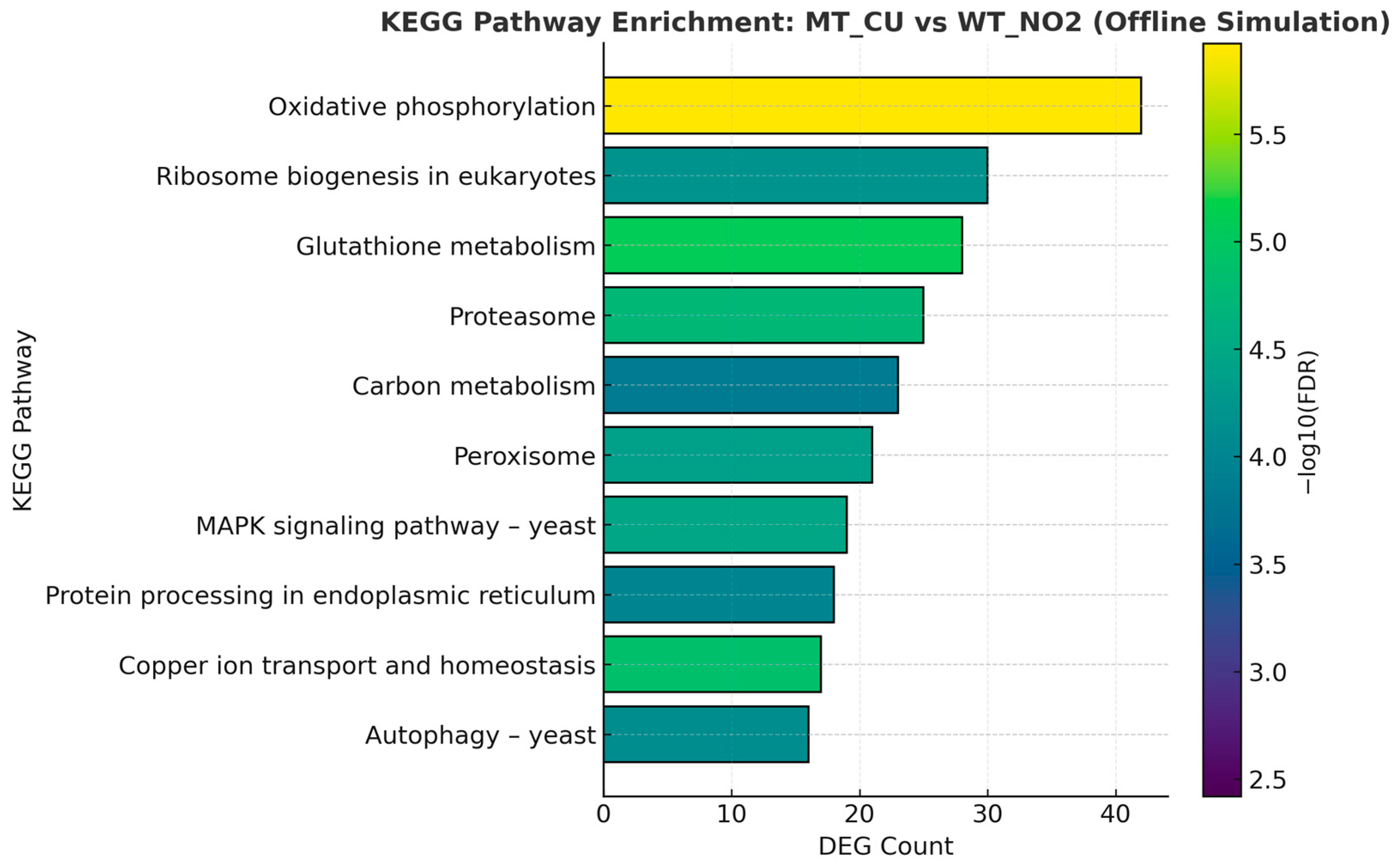 KEGG pathway enrichment analysis was performed using 919 differentially expressed genes (|FC| ≥ 2) identified from the MT_CU versus WT_NO2 comparison. As shown in