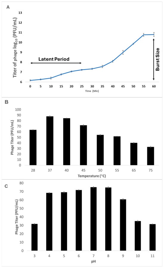 A mixture of 0.1 mL phage with 9.9 mL of K. pneumoniae in TSB was incubated for 5 min at room temperature. The mixture was centrifuged for 5 min to remove free phages, and the bacterial pellet was resuspended in 10 mL TSB. Aliquots of 100 μL were withdrawn every 5 min for 60 min to determine phage titers. The number of phage progeny/number of latent infected cells determined the burst size []. Biological triplicate was applied to minimize variability.