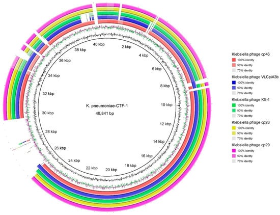 Circular map of the whole genome of K. pneumoniae CTF-1 and comparative genome maps of genome sequences of closely related bacteriophages. Gaps in the circles represent regions of low or no similarity.
