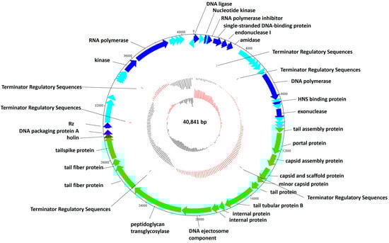 Genome sequencing was performed using the ONT ligation sequencing kit (SQK-LSK109, Oxford, UK) and the ONT native barcode kit (EXP-NBD104-114). The prepared libraries were loaded into an ONT MinION Flowcell v. 9.4.1 (FLO-MIN106D). Raw reads in Fast4 format were obtained using the MinKNOW program (v. 22.03.5). High-quality reads were obtained after barcodes and adapters were removed using the ONT-guppy (v. 6.0.6). The quality of raw fastq reads was controlled by FastQC v0.11.9 (https://www.bioinformatics.babraham.ac.uk/projects/fastqc/ (accessed on 1 June 2023)). Contigs were obtained using the flye de novo assembler (v. 2.8) []. BLAST v2.12.0 searches were performed against the NCBI nt reference database for taxonomic analysis of the contigs. Overall identity% of bacteriophage was calculated using the following formula: overall identity% = identity% × coverage []. The annotation of protein-coding genes was conducted by BLASTp against the NCBI nr database with an e value of 0.00001 and identity of 80% parameter after identifying the protein-coding genes using the prokka program v1.13 []. The existence of antibiotic resistance genes was checked using the deepARG program v1.0.2 [], and rho-independent terminators were estimated using ARNold v1.0 [].
