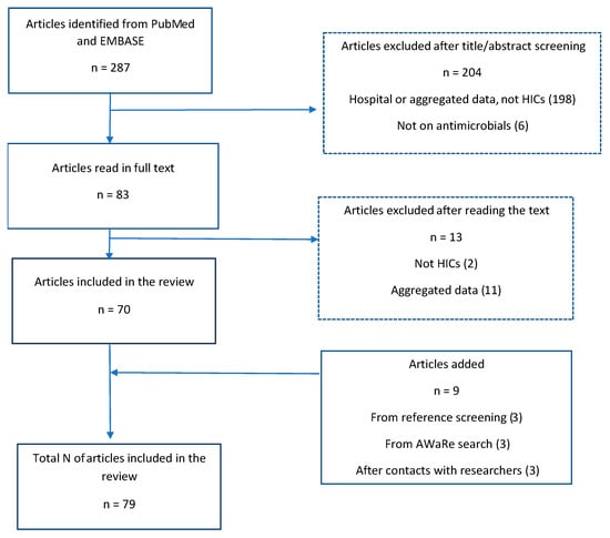 The literature search of PubMed and EMBASE identified 287 studies. After title and abstract screening, we selected 83 potentially relevant studies for full-text screening. Of these, we excluded 13 either because they reported aggregated data, or the study was not from HICs. We added nine more studies after screening references (n = 3), reaching out to 29 experts (n = 3), and conducting a targeted search for AWaRe outcome measures (n = 3). The selection process resulted in a total of 79 studies fulfilling the criteria for synthesis in this review (Figure 1).