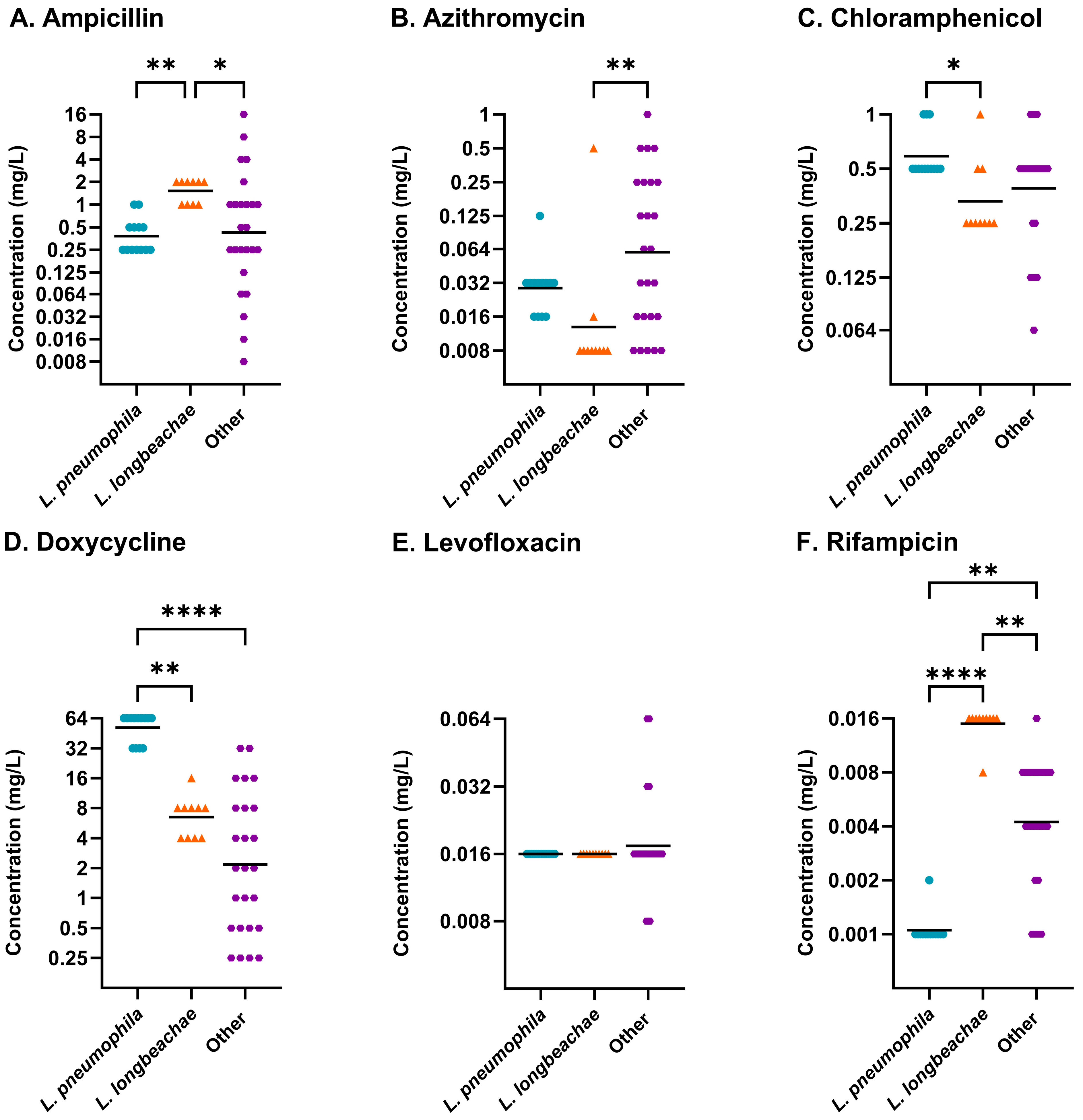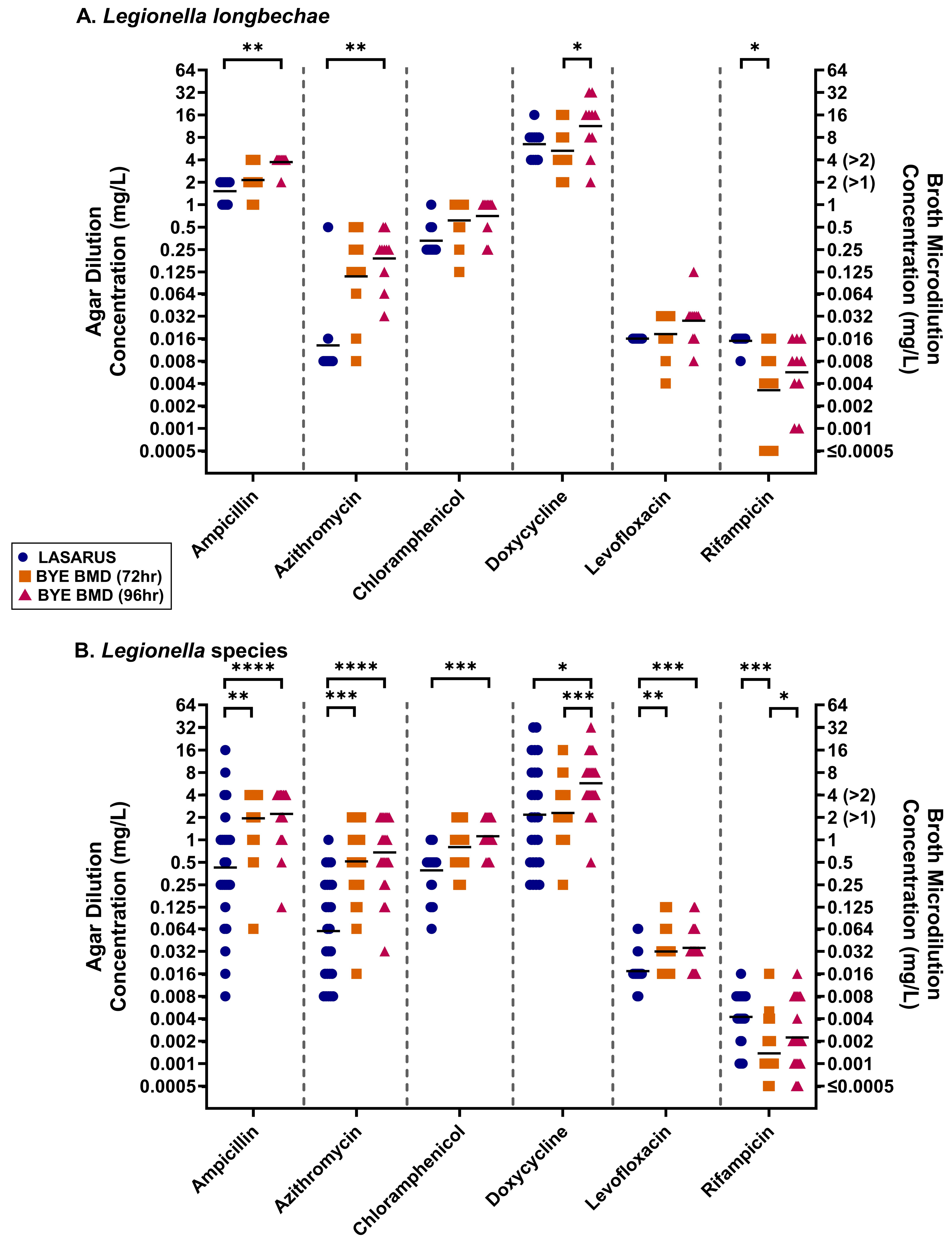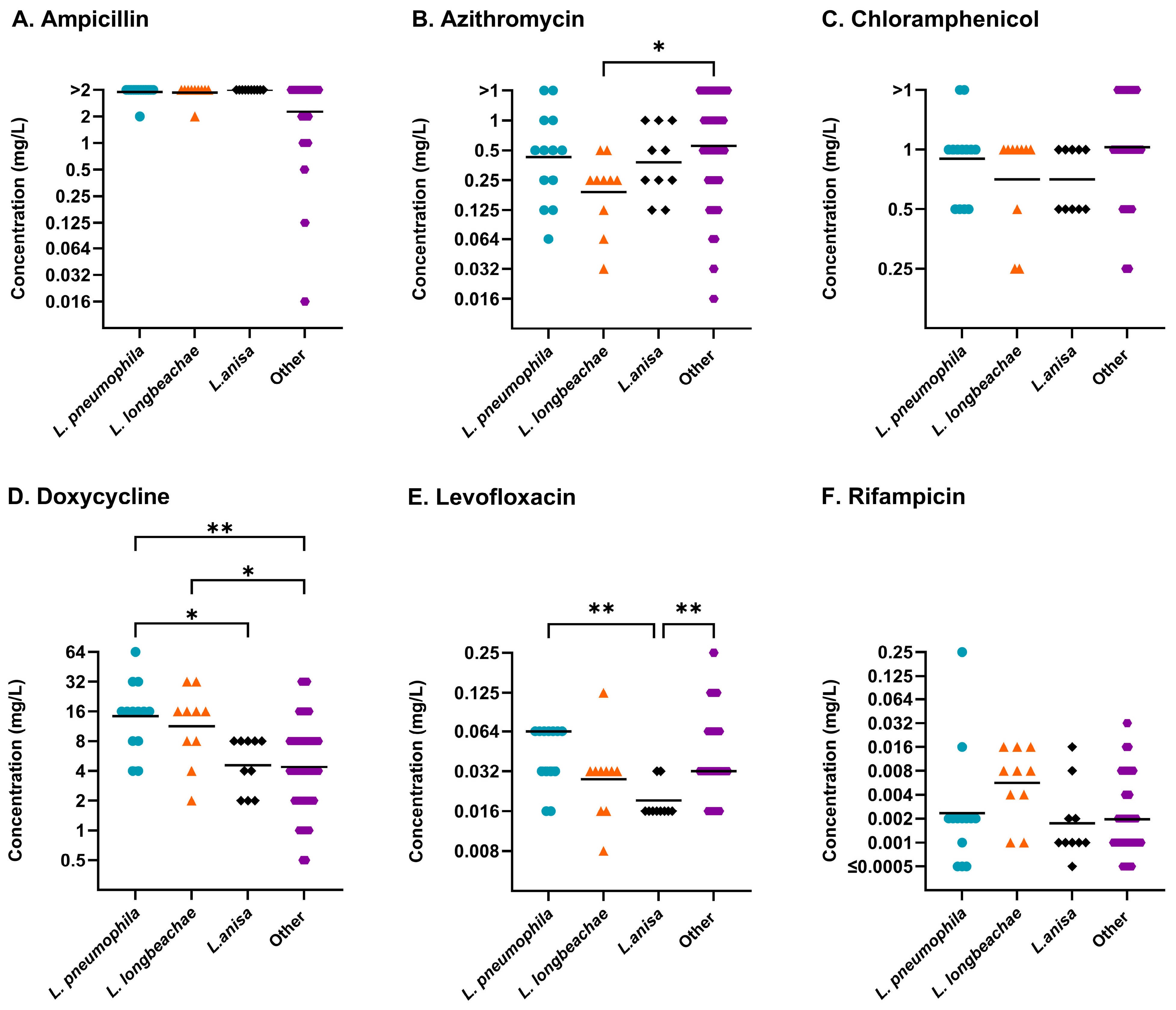 | Legionella spp. | Ampicillin | **** | LASARUS—BYE-BMD 72 h | ** |