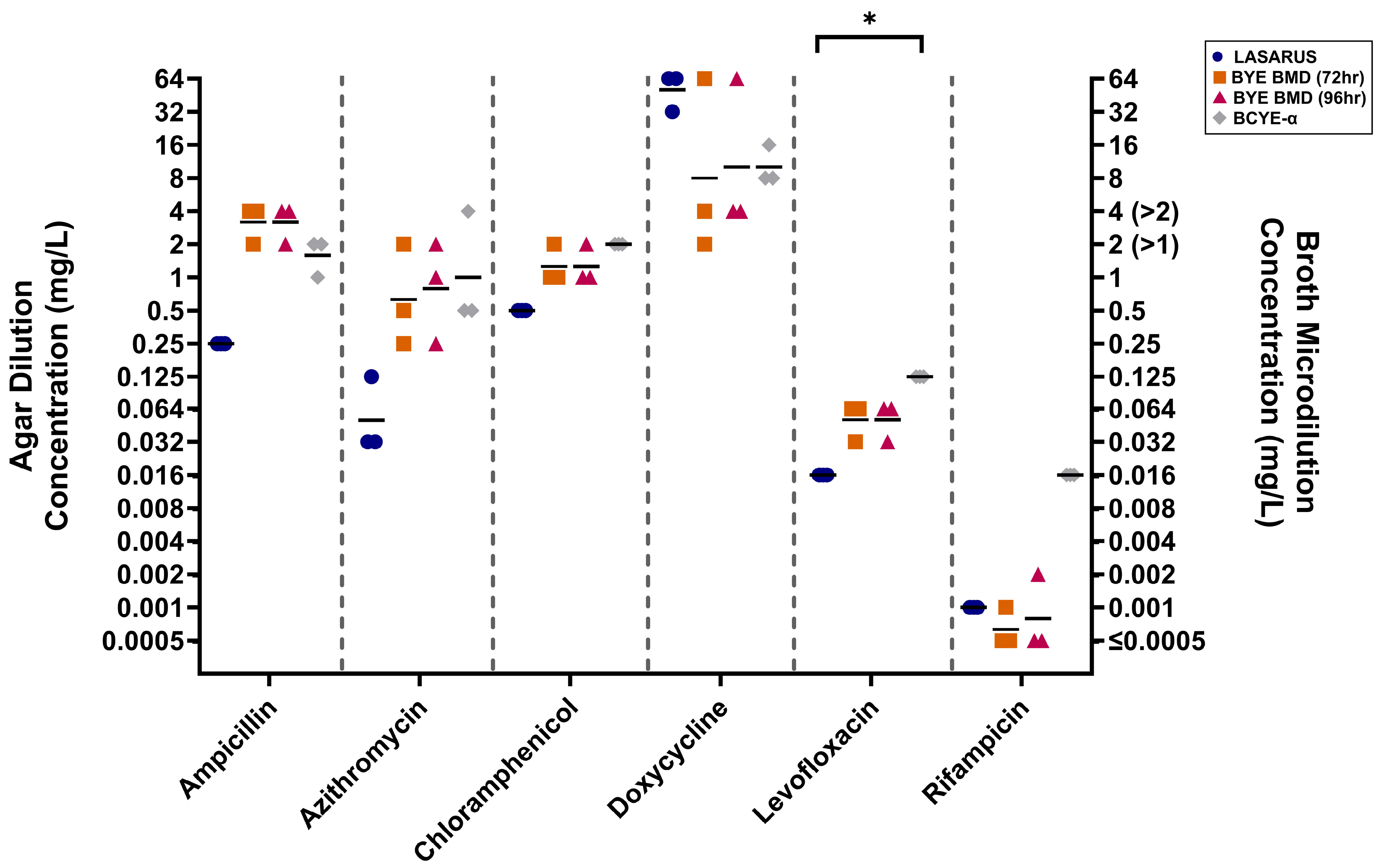 | L. longbeachae | Ampicillin | *** | LASARUS—BYE-BMD 96 h | ** |