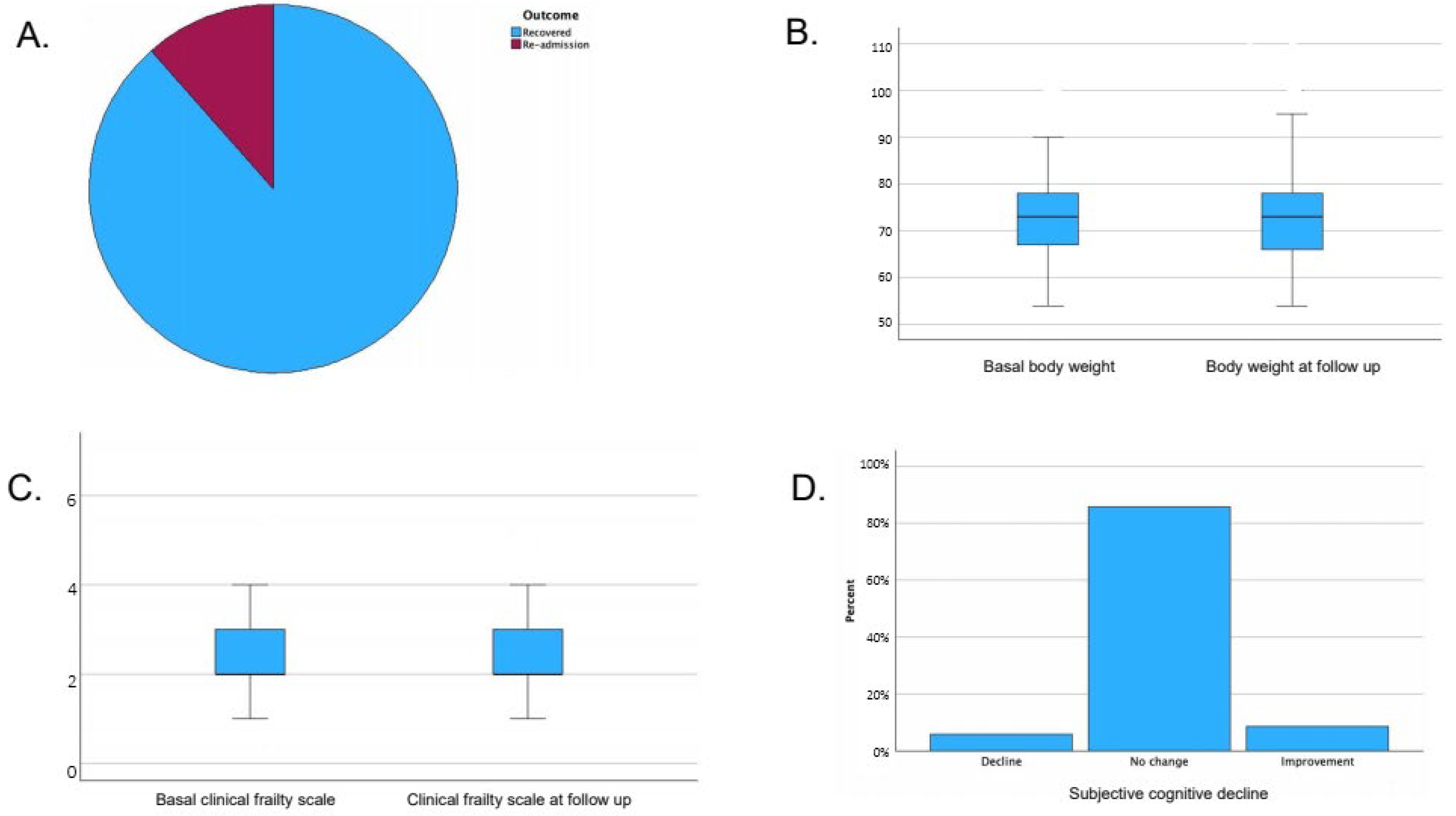 - Subjective cognitive status: A total of 85.6% reported no change, 5.9% reported decline, and 8.5% reported improvement. Subjective cognitive status was missing at follow-up for 2 patients.