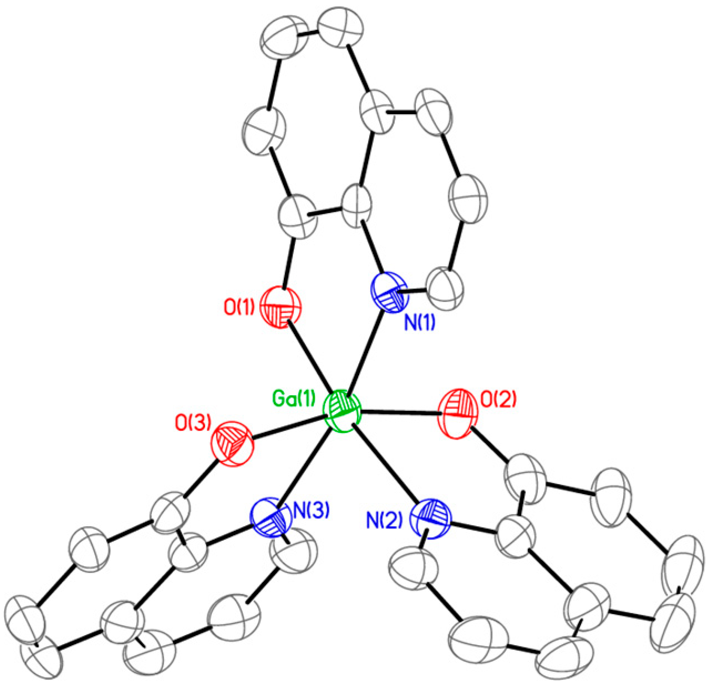 - Schmidbaur, H.; Lettenbauer, J.; Wilkinson, D.L.; Müller, G.; Kumberger, O. Modellsysteme für die Gallium-Extraktion, I. Struktur und Moleküldynamik von Aluminium- und Galliumtris(oxinaten). Z. Naturforschung B 1991, 46, 901–911. [Google Scholar] [CrossRef]