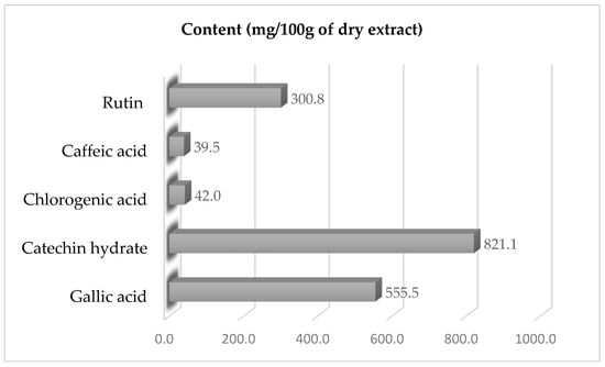 The extract contained several essential compounds, of which five are in the majority: gallic acid (555.49 mg/100 g), hydrated catechin (821.11 mg/100 g), caffeic acid (39.54 mg/100 g), hydrated rutin (300.84 mg/100 g), and chlorogenic acid (42.04 mg/100 g) (Figure 1).