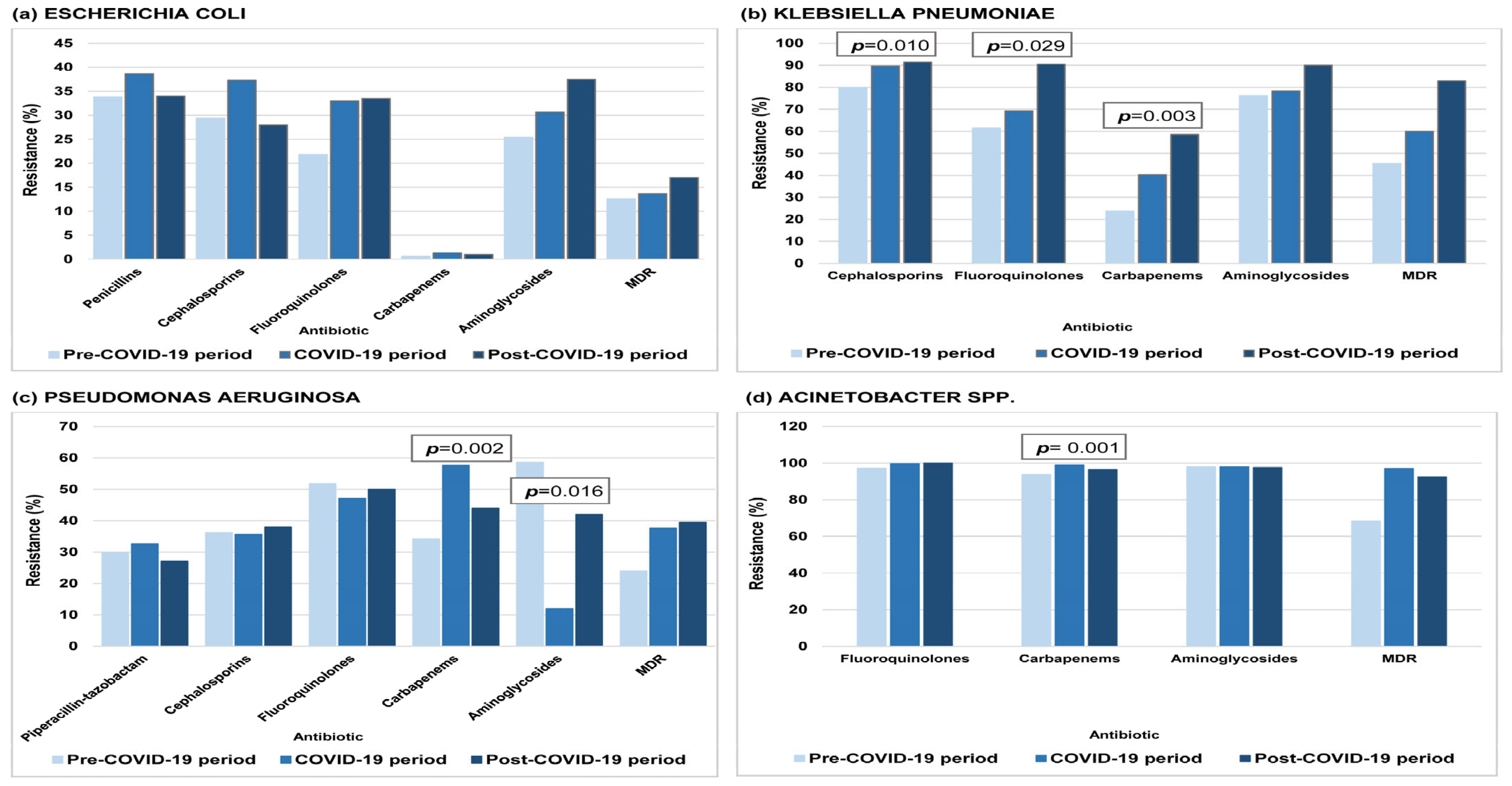 The highest proportion of MDR isolates was seen in Acinetobacter spp., reaching 97% during the COVID-19 period, followed by K. pneumoniae, which exceeded 80% in the post-COVID-19 period. A moderate MDR rate was recorded in P. aeruginosa, while E. coli showed the lowest levels throughout. Although MDR rates generally increased for all Gram-negative bacteria, none of the changes were statistically significant (Figure 1).