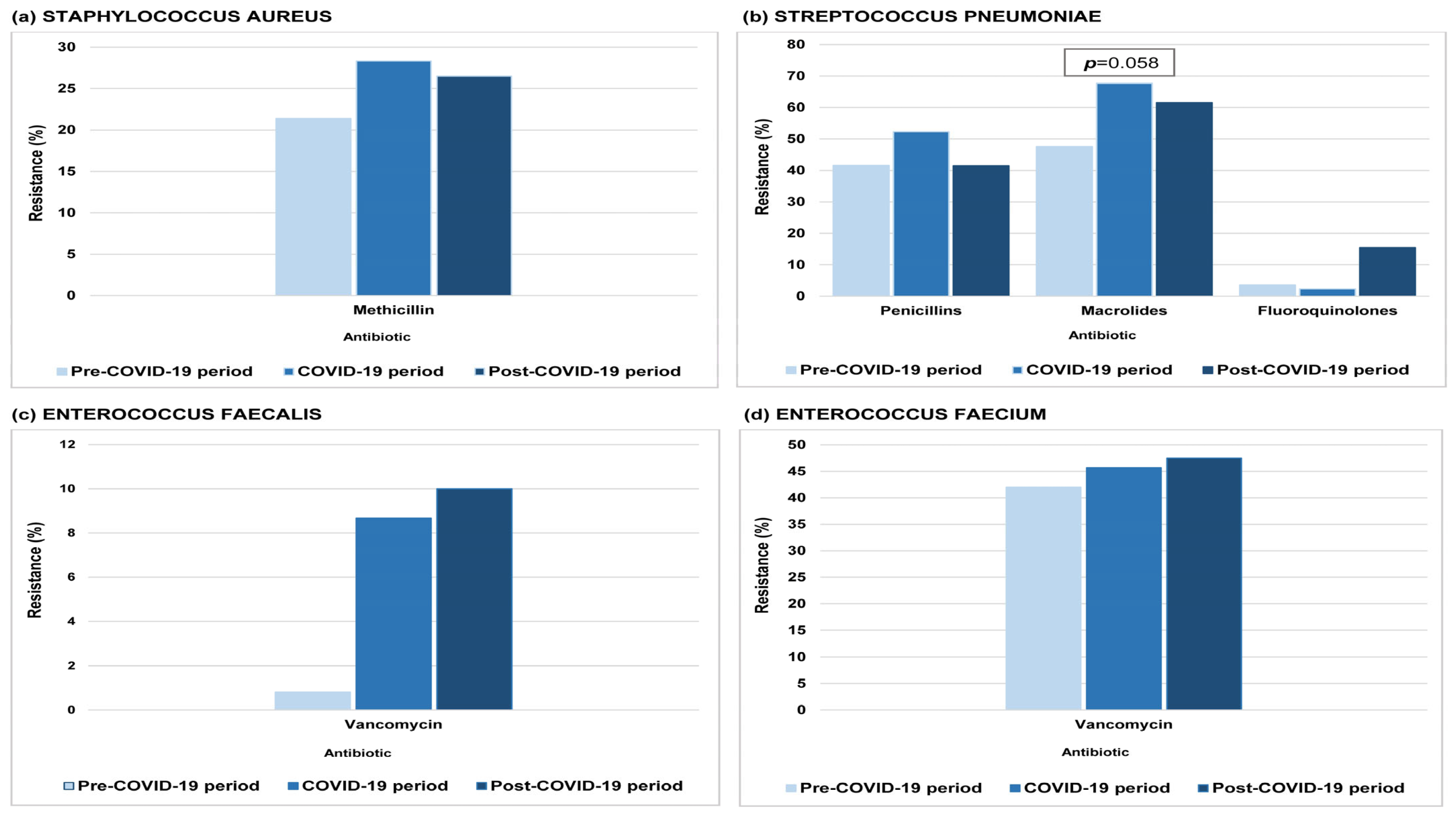 Figure 2. Antimicrobial resistance in Gram-positive bacteria at the University Clinical Centre of the Republic of Srpska, 2015–2024 (2015–2019: pre-COVID-19; 2020–2022: COVID-19; 2023–2024: post-COVID-19). (a) S. aureus. (b) S. pneumoniae. (c) E. faecalis. (d) E. faecium. Statistical significance was assessed using one-way ANOVA.
