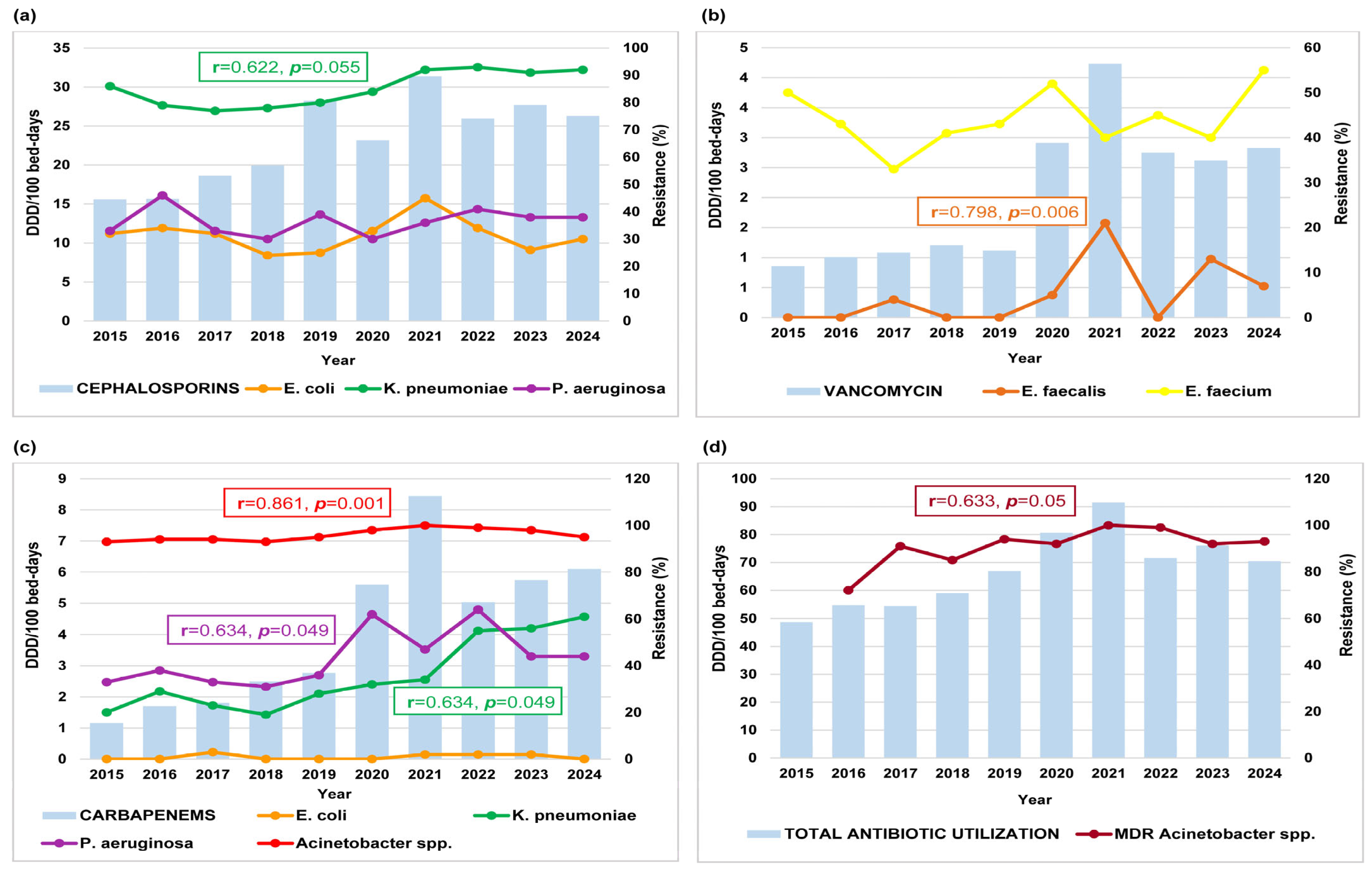 Figure 3 presents only statistically significant correlations between antibiotic utilization and bacterial resistance over the ten years. A strong positive correlation was found between carbapenem use and Acinetobacter spp. resistance (r = 0.861; p = 0.001) (Figure 3c), and between vancomycin use and E. faecalis resistance (r = 0.798; p = 0.006) (Figure 3b). Moderate correlations included cephalosporin use with K. pneumoniae resistance (r = 0.622; p = 0.055) (Figure 3a), and both carbapenem use with K. pneumoniae (r = 0.634; p = 0.049), and P. aeruginosa resistance (r = 0.634; p = 0.049) (Figure 3c). Other moderate correlations, such as penicillin use with P. aeruginosa resistance (r = 0.466; p = 0.175) and macrolide use with S. pneumoniae resistance (r = 0.594; p = 0.070) did not reach statistical significance. No additional significant correlations were observed.