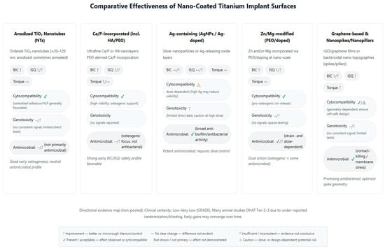 Taken together, nanoengineered coatings accelerate early osseointegration in many models, most consistently reflected in BIC and supported by increases in ISQ in selected clinical series; once integration consolidates, torque measures are commonly similar across groups, and some surfaces show no advantage at all. The balance of findings (spanning Ca/P- and Sr-augmented chemistries, anodized nanotubes, antimicrobial Ag-based designs, Zn/Mg-doped surfaces, and nanospike topographies) supports early-phase benefits with heterogeneous persistence by class, model, and follow-up, with notable counterexamples (e.g., Ag-ion TiO2, UNCD) where effects were neutral.