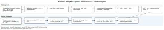 Several nanostrategies are prominent in the literature and provide a scientific rationale for a comparative evaluation []. Titanium dioxide nanotubes created by anodization present ordered pores that concentrate proteins, support osteoblast adhesion, and can serve as reservoirs for ions or drugs; multiple reviews report robust preclinical gains in bone-to-implant contact and mechanical anchorage with more variable clinical data and a need for standardized tube dimensions and surface chemistry [,,]. Nanostructured titanium modulates early protein corona (fibronectin/vitronectin), promotes integrin-mediated adhesion (α5β1/αvβ3), and activates FAK/Src/ERK signaling that supports osteoblast spreading, proliferation, and maturation. Ultra-thin calcium phosphate or hydroxyapatite deposits aim to deliver osteoconductivity while avoiding the delamination seen with early thick plasma-sprayed coatings; systematic summaries suggest the facilitation of early fixation without clear late advantages when compared with optimized microrough titanium [,]. Selected nanotopographies and Ca/P-containing chemistries are associated with increased ALP, RUNX2, and OCN expression, consistent with improved early bone-to-implant contact. In parallel, contact-killing nanospikes/graphene and ion-releasing coatings (e.g., Ag, Zn/Mg) can limit early biofilm accrual, provided cytocompatibility is maintained []. Carbon-based coatings such as graphene and reduced graphene oxide have been explored for their ability to modulate protein adsorption and cellular signaling while providing intrinsic antibiofilm effects; recent evaluations show promise but also emphasize dose-dependent cytotoxicity risks and the importance of stable integration with the titanium substrate. Additional approaches include trace element incorporation such as strontium, zinc, silver, or magnesium to promote osteogenesis and reduce bacterial viability, ultrafine-grained bulk titanium produced by severe plastic deformation to couple mechanical resilience with hierarchical topography, and catalytic nanozymes that could generate local reactive species to deter biofilm without antibiotics [].