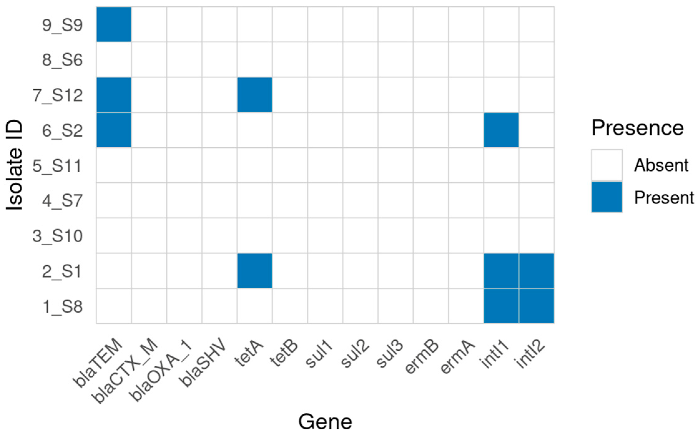 | ID | AMP/β-Lactamase (blaTEM, blaCTX-M, blaOXA-1, blaSHV) | CHL | GEN | SXT/Sulfonamide (sul1, sul2, sul3) | TET (tetA/tetB) | Integrons (intI1, intI2) |