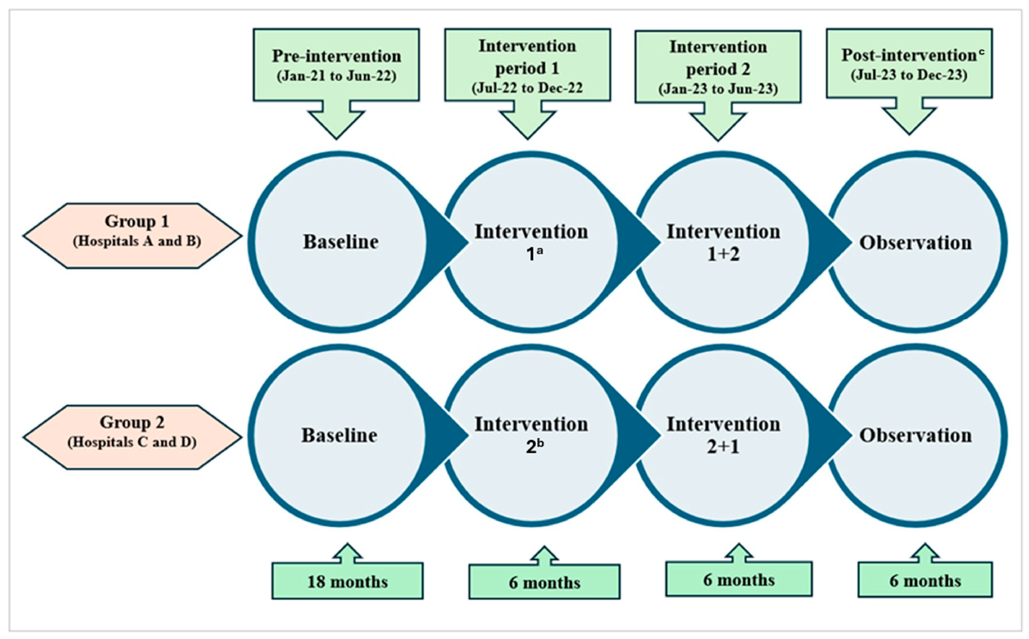 | Pre-Intervention Period 1 (Jan 2021–Dec 2021 | Pre-Intervention Period 2 (Jan 2022–Jun 2022) | Intervention Period 1 Intervention 1 a (Jul 2022–Dec 2022) | Intervention Period 2 Intervention 1 + 2 (Jan 2023–Jun 2023) | Post-Intervention (Jul 2023–Dec 2023) | Pre-Intervention Period 1 (Jan 2021–Dec 2021) | Pre-Intervention Period 2 (Jan 2022–Jun 2021) | Intervention Period 1 Intervention 2 b (Jul 2022–Dec 2022) | Intervention Period 2 Intervention 2 + 1 (Jan 2023–Jun 2023) | Post-Intervention (Jul 2023–Dec 2023) | |