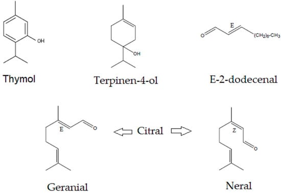 Essential oils are a group of secondary metabolites present in the volatile fraction of various plant organs, whose main components are terpenes (especially monoterpenes and sesquiterpenes) and aromatic compounds (benzene derivatives) []. Among the molecules that come from essential oils with a high antimicrobial activity we have thymol [,,], terpinen-4-ol [,], citral [,,,], and E-2-dodecenal [,,].