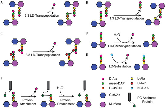 Peptidoglycan (PG) is an essential component of the bacterial cell envelope. It forms a net-like macromolecule around the cytoplasmic membrane (CM) and is needed by bacteria to prevent lysis due to their turgor and to maintain cell shape [1,2]. PG consists of glycan chains of alternating N-acetylglucosamine (GlcNAc) and N-acetylmuramic acid (MurNAc) joined by peptides bound to the lactyl group of MurNAc [1,2,3]. The nascent peptides consist of five amino acids. In Gram-negative bacteria, the most common sequence is L-Ala-D-iso-Glu-meso-diaminopimelic acid (meso-DAP)-D-Ala-D-Ala. In Gram-positive bacteria, the peptides are more variable at positions two and three with D-isoGln and L-Lys being the most common. The synthesis of PG from lipid II requires PG synthases to polymerise the glycan strands by glycosyltransferases (GTase) and crosslink the peptides by transpeptidases (TPase). Peptides from adjacent glycan chains can be crosslinked with either DD or LD bonds formed by penicillin-binding proteins (PBPs) and LD-Transpeptidases (LDTs), respectively. Both release a terminal D-Ala residue during the transpeptidation reaction [1,4]. PBPs require a pentapeptide donor and form crosslinks between the fourth residue of one peptide and the third of another (4,3-DD-crosslinks). LDTs require a tetrapeptide donor and form LD-crosslinks between position three of a peptide and three of another (3,3-LD crosslinks) or position one of a peptide and three of another (1,3-LD-crosslinks) (Figure 1) [1,2,5,6,7]. DD-crosslinks are the predominant crosslinks in most species, formed during PG synthesis for growth and cell division [2,3]. LD-crosslinks are often formed in mature PG as part of cell wall repair, stress responses, or antibiotic resistance mechanisms [1,7,8]. While crosslinking is the most common reaction, LDTs have a wider range of reactions they catalyse (Figure 1), not all of which are LD bonds as seen in the protein attachment and certain substitution reactions [9,10,11,12,13]. Hence, LDTs are defined by the LD meso-DAP-D-Ala bond they break rather than the bonds they form [14,15].