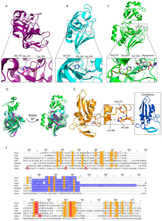 The structure of Ldtfm, alongside YkuD in Bacillus subtilis, lead to the characterisation of the catalytic domain termed YkuD. This domain consists of a β-sandwich of two five-six strand mixed β-sheets joined by two hinge α-helices with activity, which is facilitated by the catalytic triad (Figure 2A) [24,57]. The YkuD-fold contains the sequence ϕGϕHG(S/T)-(X)10(S/T)XGCϕR(M/L), where ϕ is a hydrophobic residue and X denotes any amino acid, which is conserved across various LDTs from Gram-negative and Gram-positive species (Figure 2F) [24]. The structure of the YkuD-domain is also conserved, forming a groove with two cavities, inner and outer, which provide access to the catalytic site. The exception is the variable capping loop region (Figure 2F). This region is believed to occlude the catalytic site upon substrate binding and ranges from several unstructured residues in B. subtilis YkuD (Figure 2A), to more complex secondary structures as seen in M. tuberculosis LdtMt2 and E. coli LdtD (Figure 2B–D) [58,59,60]. Template modelling scores (TM-scores), ranging from 0–1, where 1.0 indicates identical structure of the catalytic domains of LdtMt2 and LdtD against YkuD are 0.56 and 0.60, respectively [61]. These are evident of the conserved YkuD fold despite variations in the capping loop and additional secondary structure of the larger LdtMt2 and LdtD (Figure 2D).