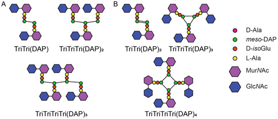 The high amount of LD-crosslinks in C. difficile PG differentiates it from many species, however this may extend to unique muropeptides as well. Recently, Galley et al. reported double-crosslinked dimers and cyclic trimers and tetramers, with LD-crosslinks formed to both the chiral centres of meso-DAP based on mass spectrometry analysis (Figure 4B) [20]. These unusual muropeptides were identified in vitro when testing LdtCd2 and LdtCd3. Very low levels (0.05–0.13%) were also detected in PG extracted from cultures [20]. Double crosslinked dimers have not been observed before but given meso-DAP has both chiral centres bonded in canonical LD-trimers, this structure is plausible (Figure 4A) [1,11]. The proposed cyclic multimers raise questions about the orientation of the glycan chains to allow the peptides to be in close enough proximity for this structure to form (Figure 4A) [1,108,109].